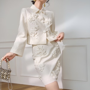 スタンドカラーショートジャケット&スカートスーツは、エレガントなスタイルを求める大人の女性に最適なアイテムです。優しいオフホワイトカラーはどんなシーンでも映え、上品さを演出します。スタンドカラーのショートジャケットは、顔周りをすっきりと魅せるデザインで、軽やかでクールな印象を与えます。スカートは美しいシルエットを描き出し、洗練されたコーディネートを実現します。ぜひこちらのスーツをクローゼットに加えて、様々なシーンでお楽しみください。