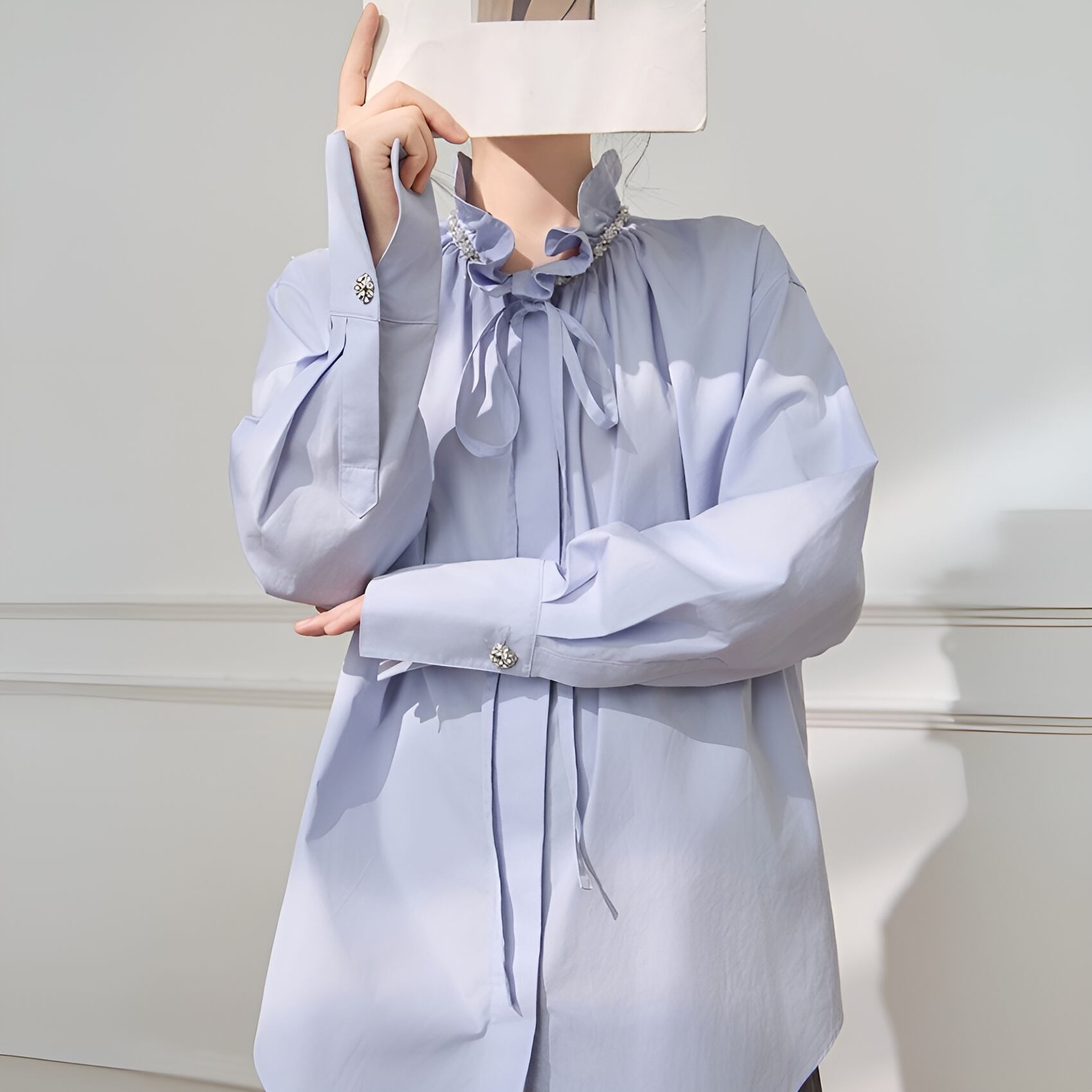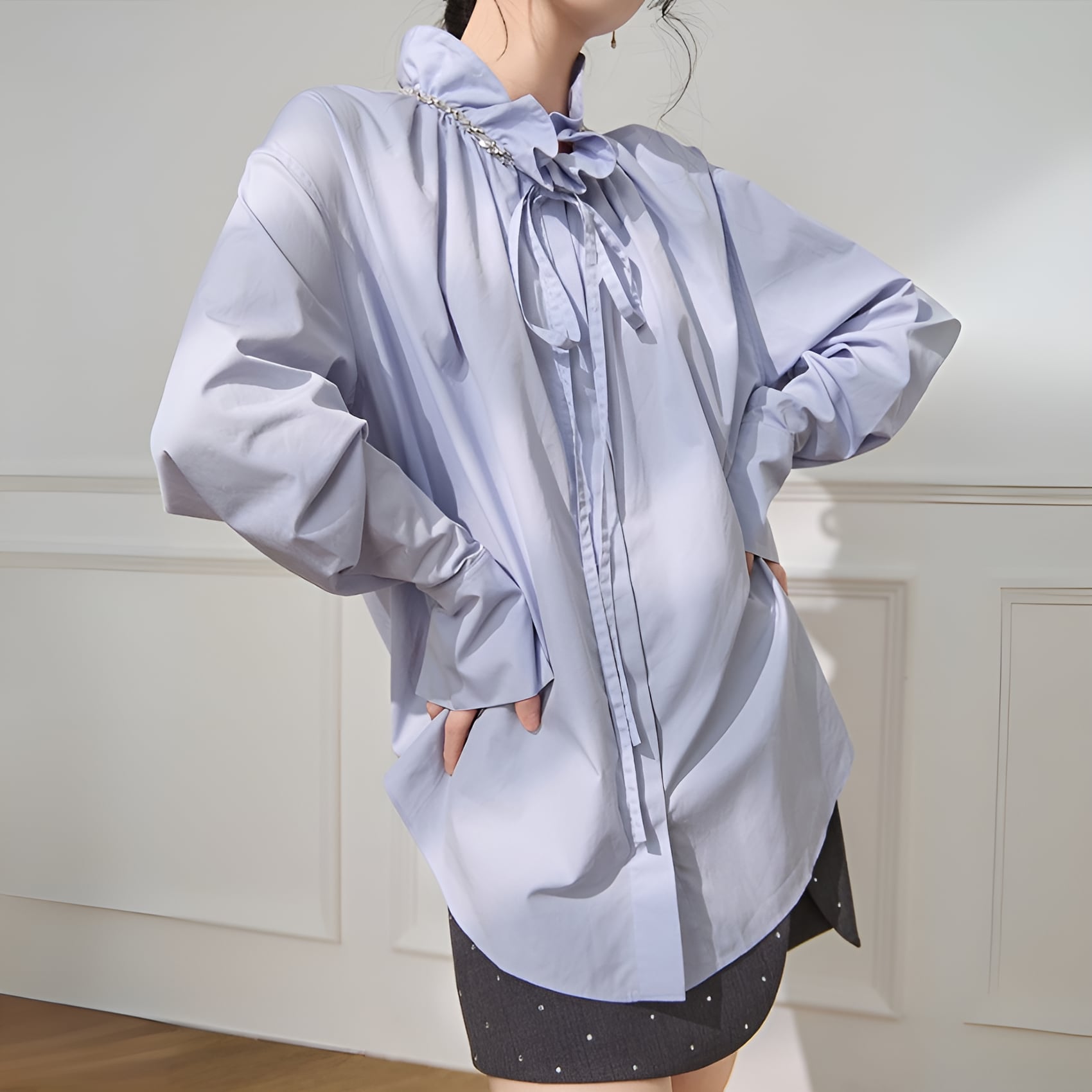 2025年新作フレンチトップリボン付きブルーシャツは、リラックスしたシルエットでありながら、エレガントさを兼ね備えた一着です。さわやかなブルーの色合いがどんなコーディネートにもマッチし、デイリーユースから特別なお出かけまで幅広く活躍するアイテムとなります。トップリボンのデザインが、シンプルながらもセンスを感じさせ、女性らしさを引き立てます。気軽に着られるゆったりしたスタイルで、日々のコーデに華やかさをプラスすることができるでしょう。