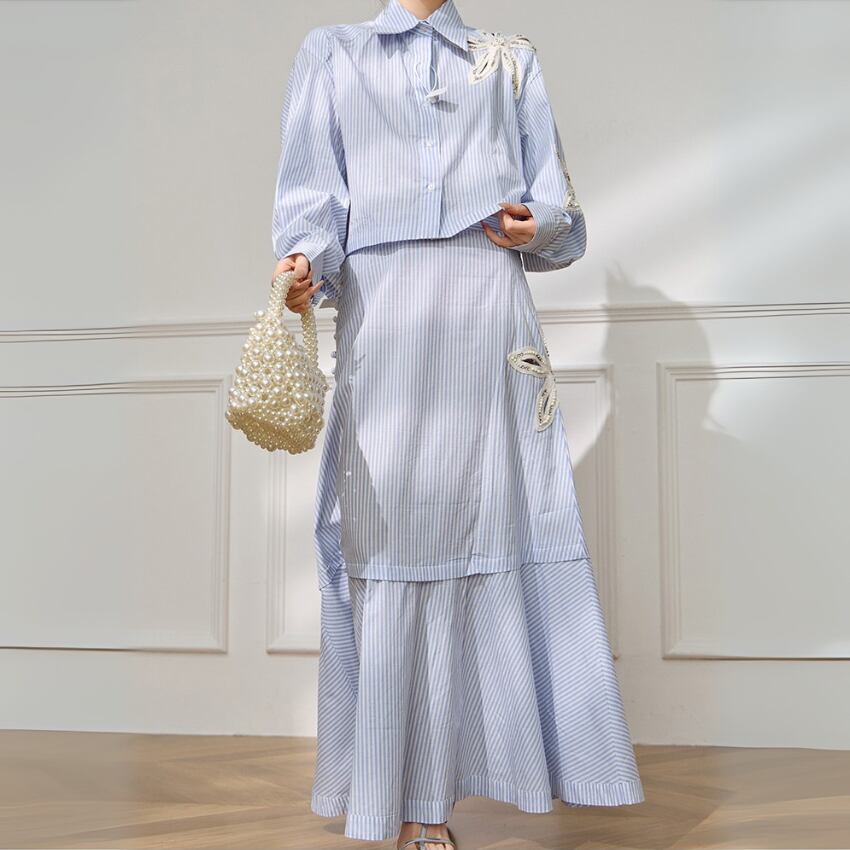 中空スプライシング刺繍ブルーストライプシャツは、洗練されたデザインと上品な色合いが魅力のアイテムです。美しいブルーストライプに施された中空スプライシング刺繍が、さりげなく個性を演出。カジュアルからビジネスシーンまで幅広く対応できるため、デイリーユースに最適です。軽やかな素材感と適度なフィット感で、着心地にもこだわり、まさにスタイルを引き立てる一枚となることでしょう。シンプルなボトムスやアクセサリーとのコーディネートで、日常をよりおしゃれに彩ることができます。