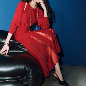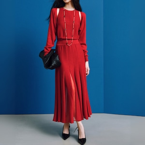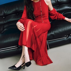 ニットショール&ノースリーブプリーツドレスは、シックなレッドとエレガントなブラックの2色展開で、さまざまなシーンで活躍できるアイテムです。ニットショールは柔らかな肌触りを実現し、温かみのある雰囲気を演出します。また、ノースリーブデザインは女性らしさを引き立て、特別な日からデイリーユースまで幅広くご利用いただけます。プリーツの細やかなディテールが美しいラインを作り出し、着る人に自信を与えること間違いなしです。こちらのドレスを取り入れ、あなたのスタイルにさらなる魅力を追加してみてはいかがでしょうか。