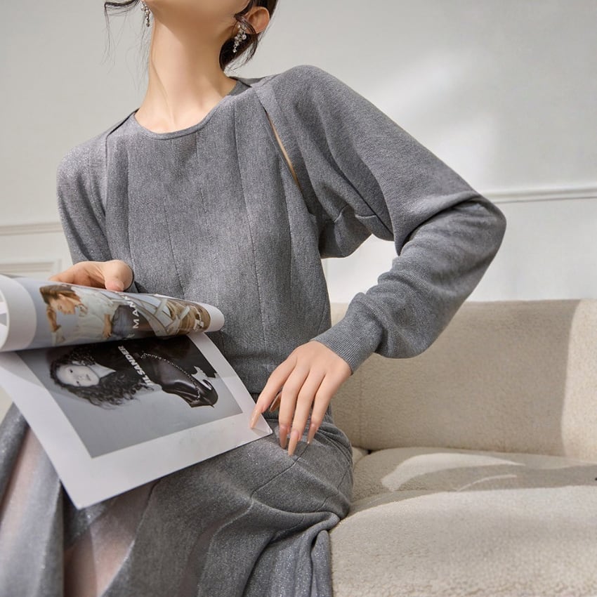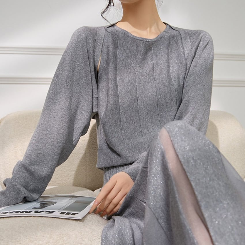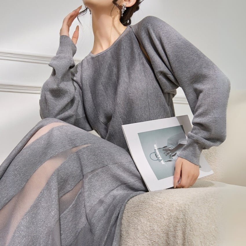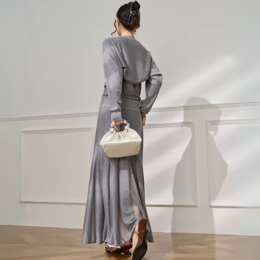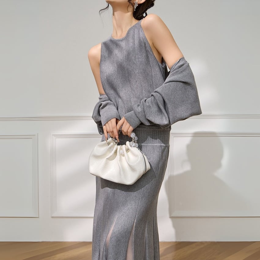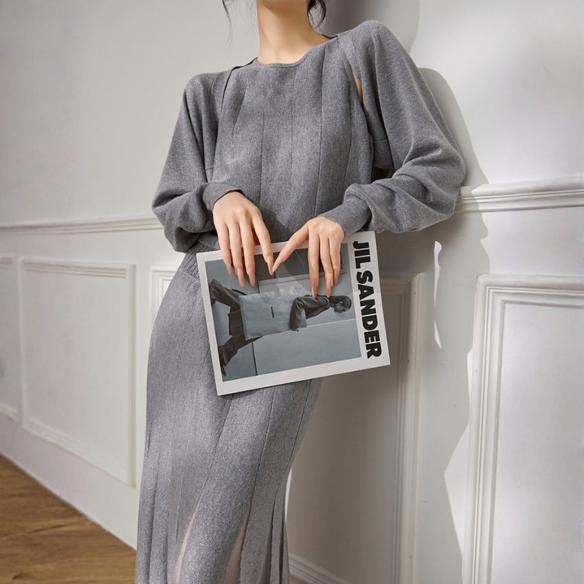 グレーカラーニットショール&ノースリーブプリーツドレスは、エレガントなデザインと流れるようなラインが魅力の一着です。柔らかなニットショールが顔回りをやさしく包み込み、ノースリーブのプリーツドレスが美しいシルエットを引き立てます。またノースリーブのプリーツドレス部分は、動くたびに華やかさを演出し、特別な日のコーディネートにもピッタリです。スタイリッシュでありながらもリラックスした雰囲気を演出できるこちらのアイテムを、ぜひあなたのワードローブに加えてみてはいかがでしょうか。