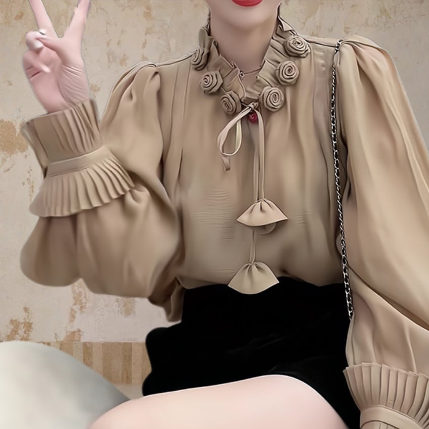フレンチローズデザインスタンドカラーパフスリーブブラウス BM1227