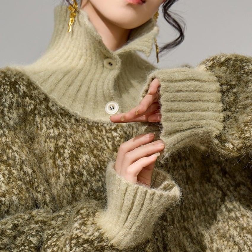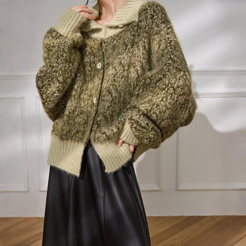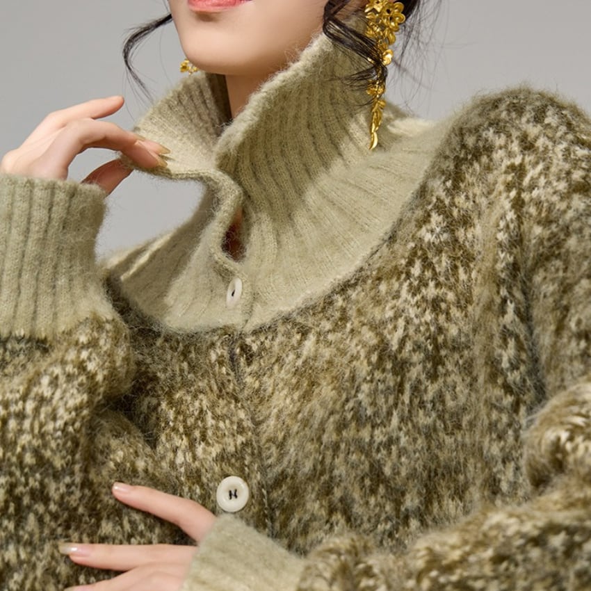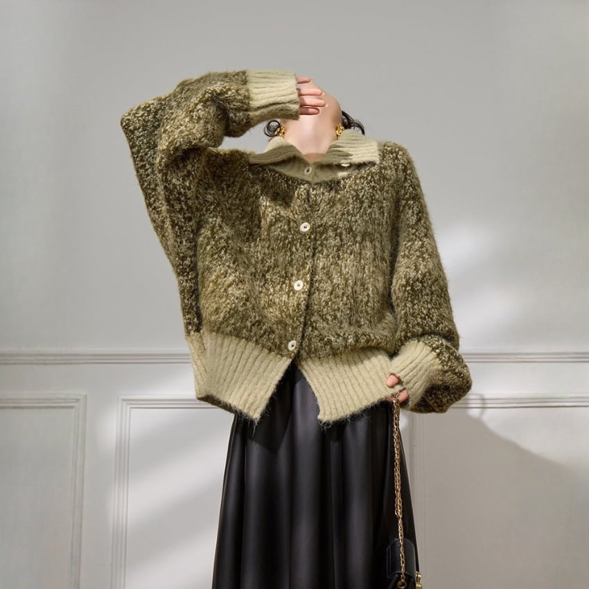 シックスタイルハイネックニットカーディガンは、ソフトグリーンの優しい色合いが魅力のルーズニットカーディガンです。高いデザイン性を持ちながらも、ゆったりとしたシルエットでリラックスした着心地を実現します。季節の変わり目にもぴったりのアイテムで、シャツやトップスの上に軽く羽織るだけで、コーディネートが一気におしゃれに決まります。どんなスタイルにも合わせやすく、デイリーユースから特別なシーンまで幅広く活躍する一着です。自分らしいスタイルを楽しみながら、こちらのカーディガンでときめきをプラスしてみてはいかがでしょうか。
