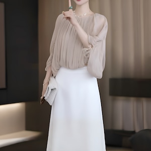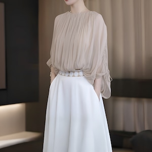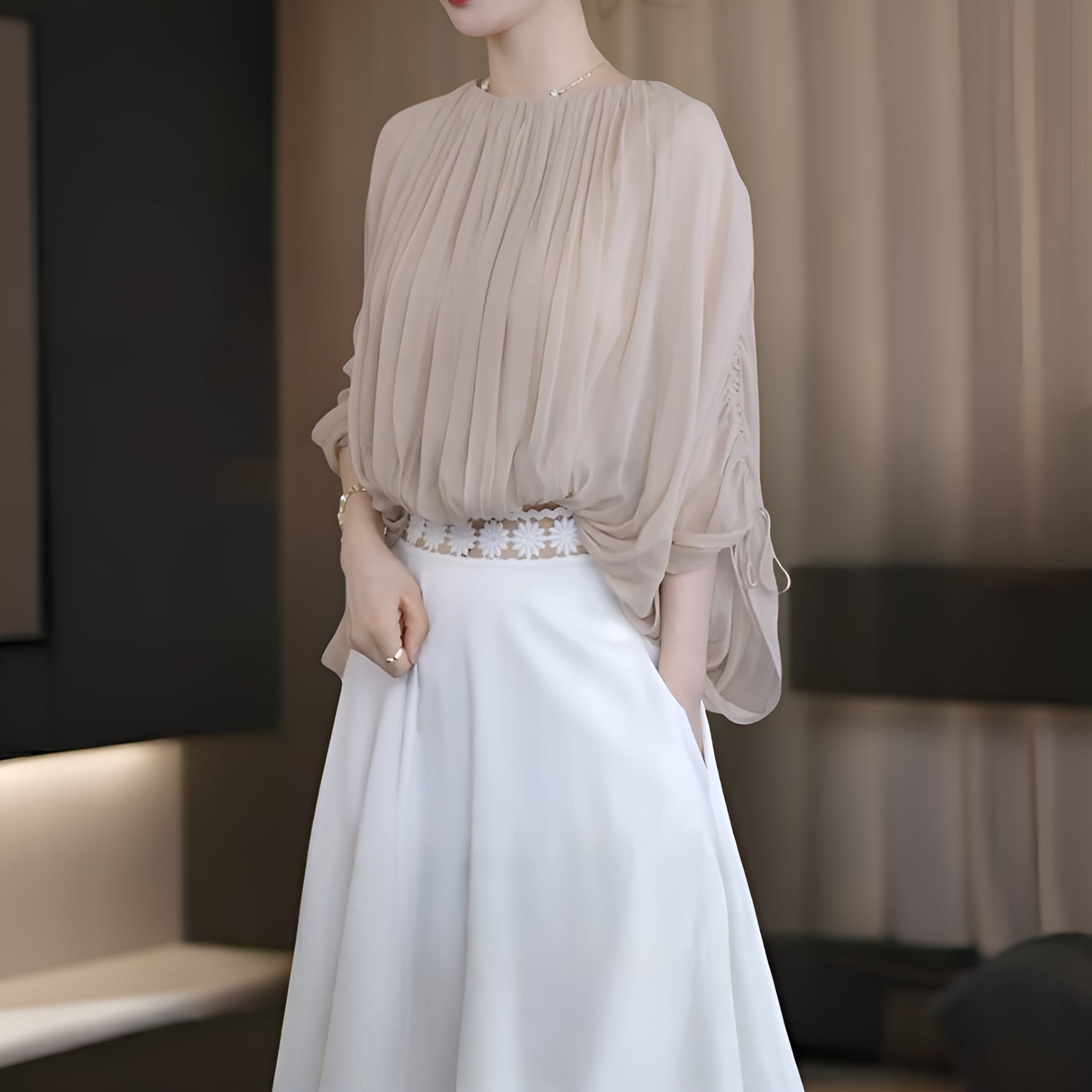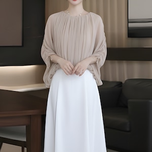 フリルバットウィングスリーブエレガントブラウスは、女性らしい魅力を引き立てるライトグレーの一着です。独特のフリルデザインとバットウィングスリーブが、さらに洗練された印象を与え、普段使いから特別なシーンまで幅広く活躍します。流れるようなラインが体のラインを美しく見せるため、エレガントさを演出しつつも快適さを兼ね備えています。こちらのブラウスを身に着けて、自信に満ちたスタイリングを楽しんでみてはいかがでしょうか。
