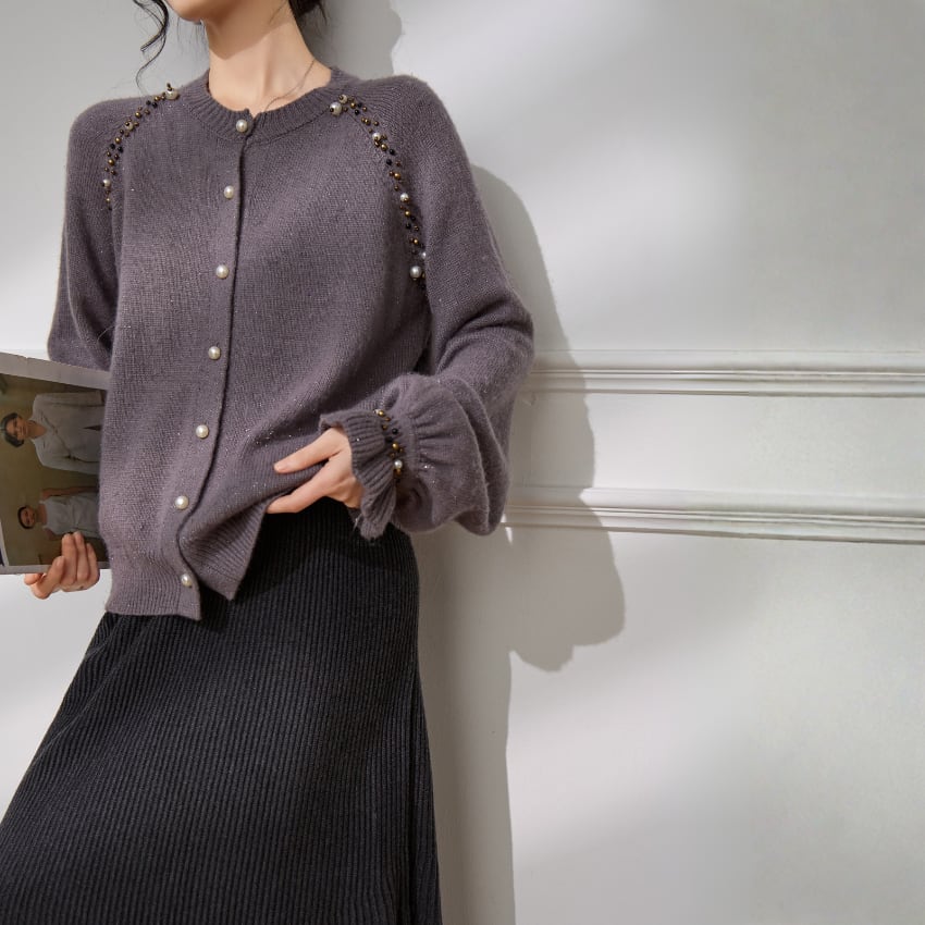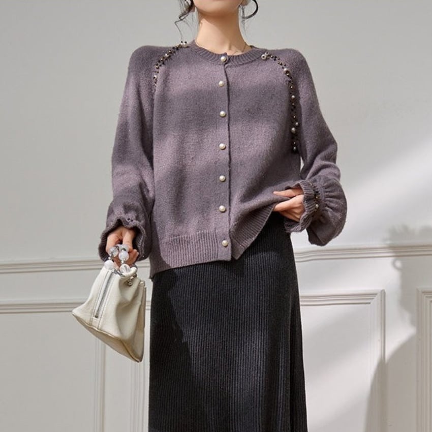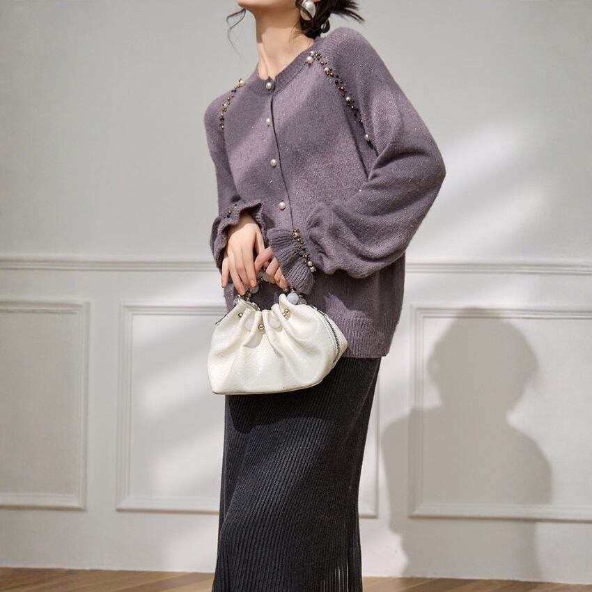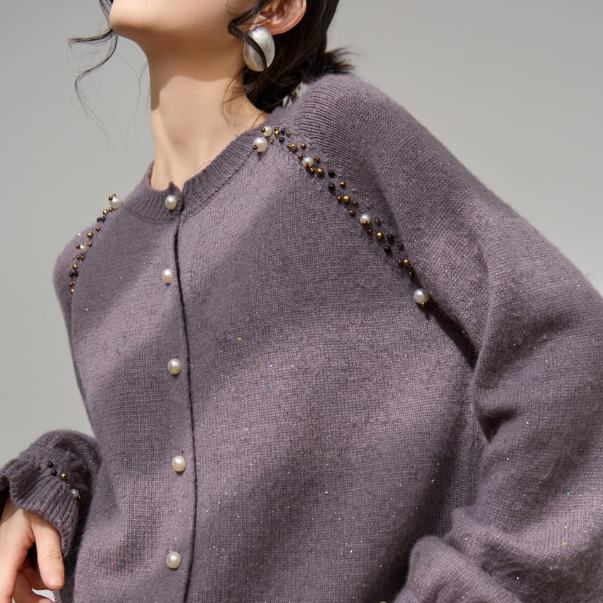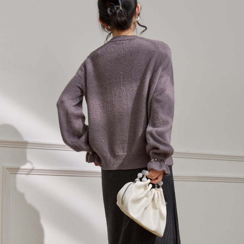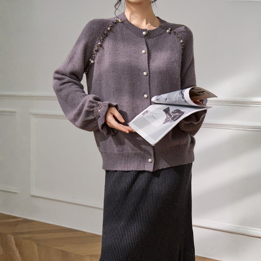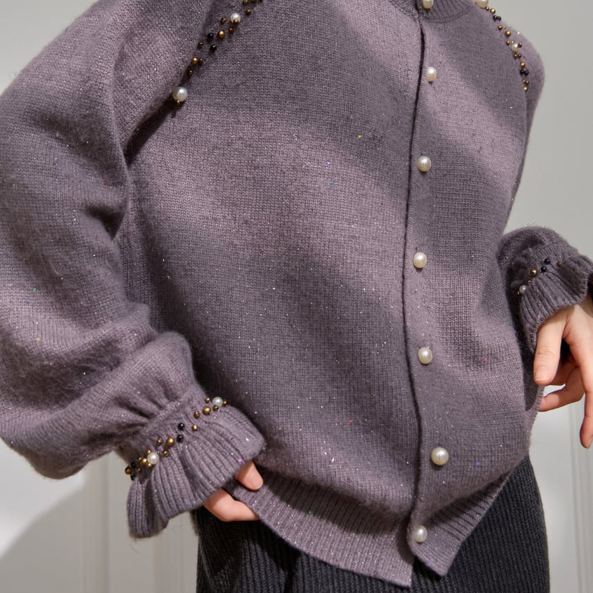 新作パールニットカーディガンは、ラグランスリーブのデザインが特徴的な一着です。優しいグレーの色合いが、さりげないおしゃれを演出します。カジュアルな日常使いから、オフィススタイルまで幅広く活躍するアイテムです。ニット素材の柔らかな風合いが心地よい着心地をもたらし、軽やかに羽織れるのも魅力的です。こちらのカーディガンをコーディネートに加えて、季節を問わずスタイリッシュな印象を楽しんでみてはいかがでしょうか。
