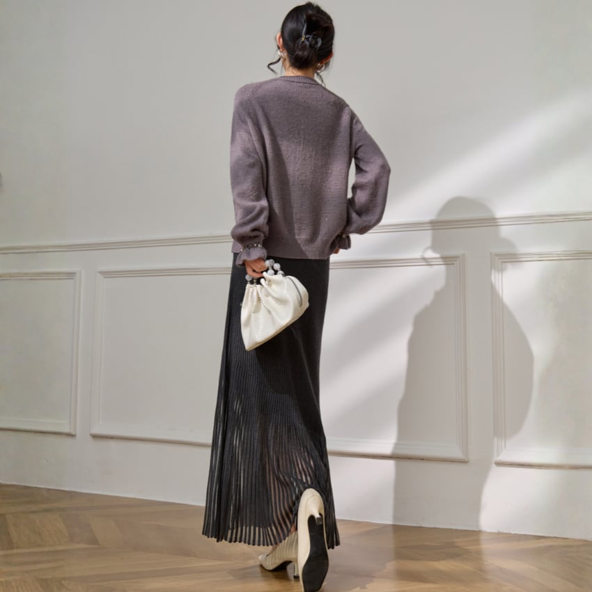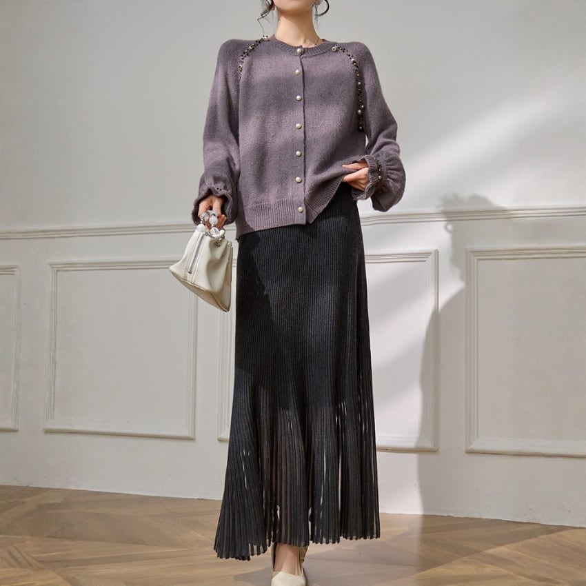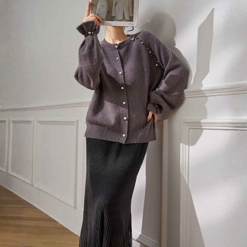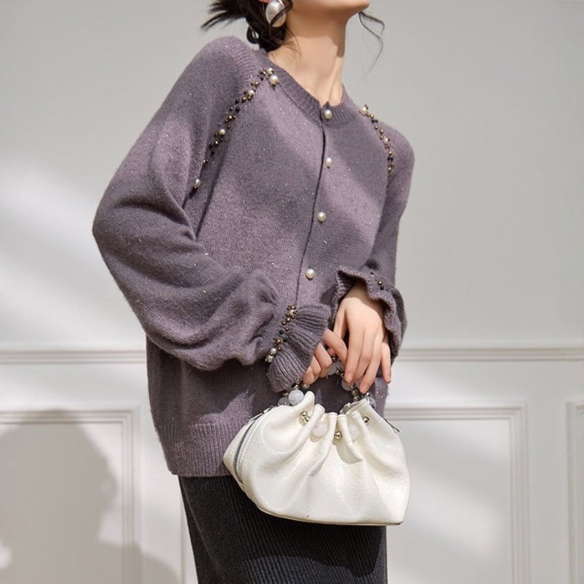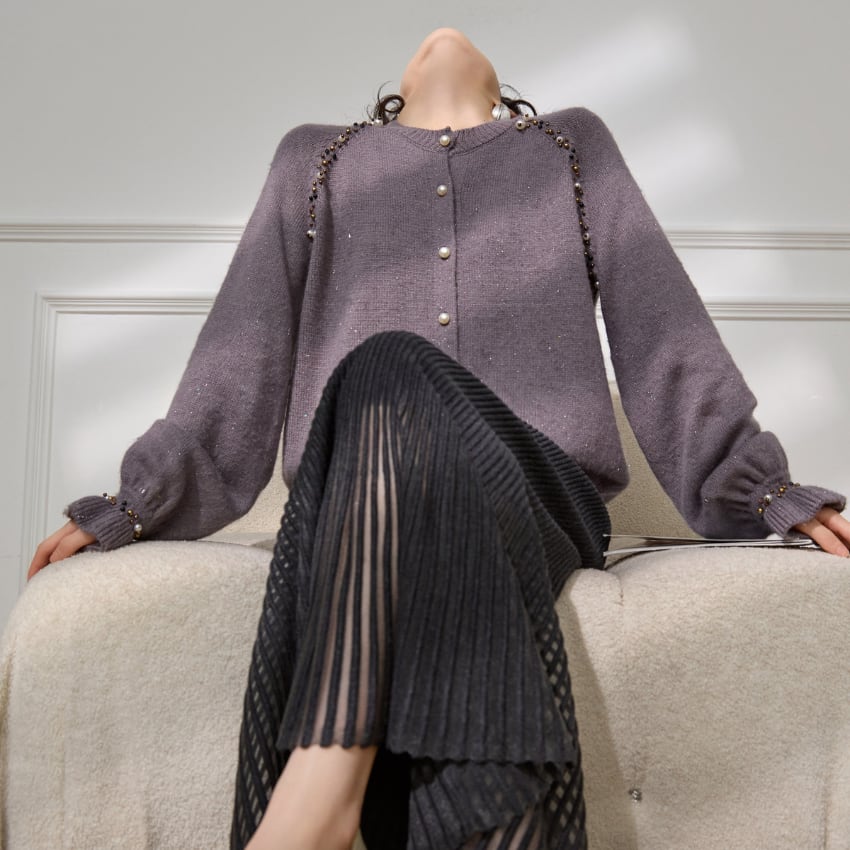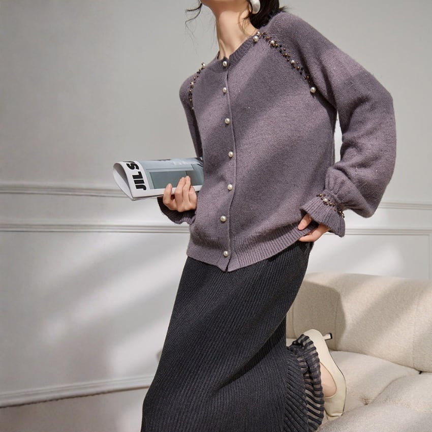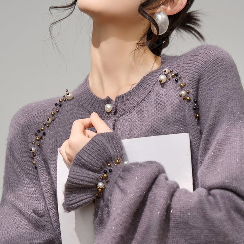 新作パールニットカーディガンは、ラグランスリーブのデザインが特徴的な一着です。優しいグレーの色合いが、さりげないおしゃれを演出します。カジュアルな日常使いから、オフィススタイルまで幅広く活躍するアイテムです。ニット素材の柔らかな風合いが心地よい着心地をもたらし、軽やかに羽織れるのも魅力的です。こちらのカーディガンをコーディネートに加えて、季節を問わずスタイリッシュな印象を楽しんでみてはいかがでしょうか。