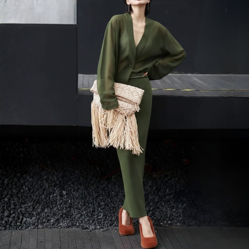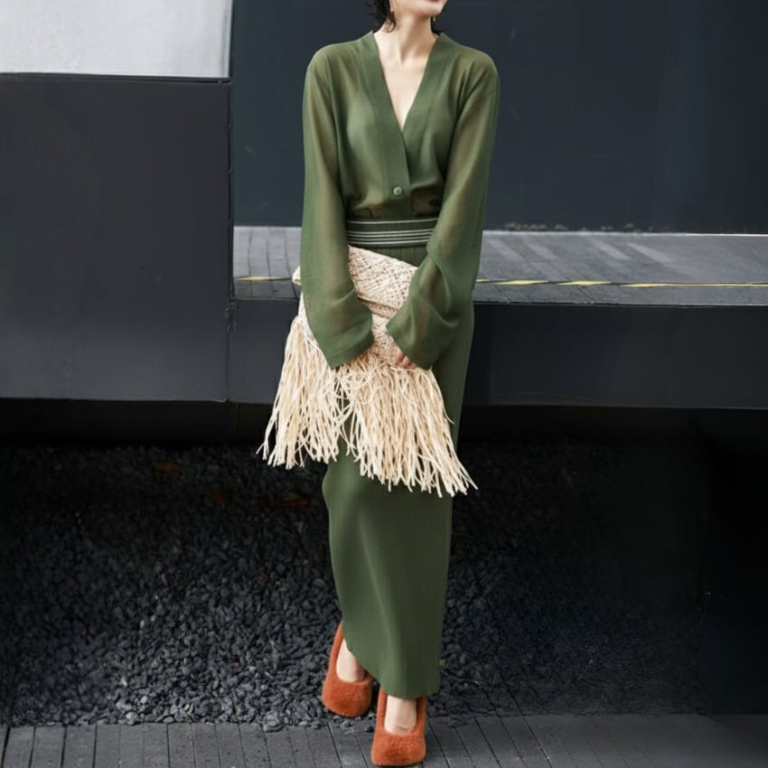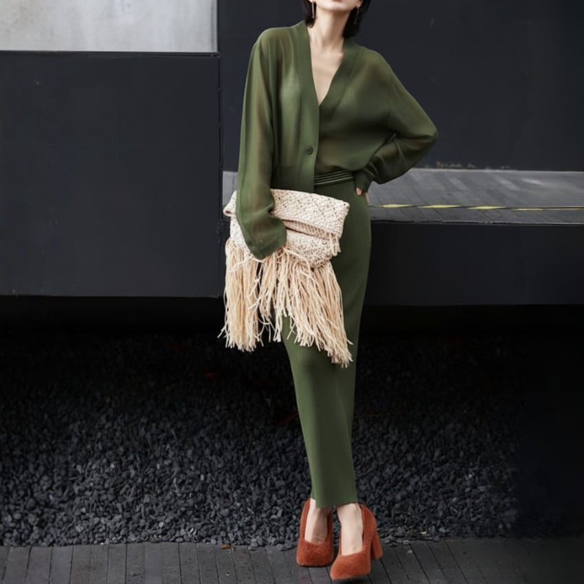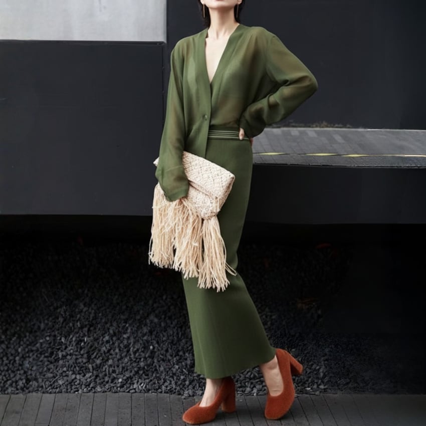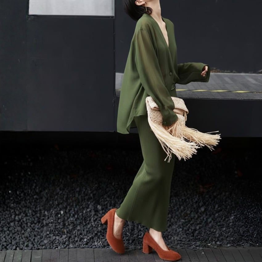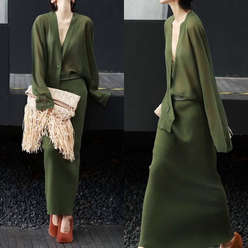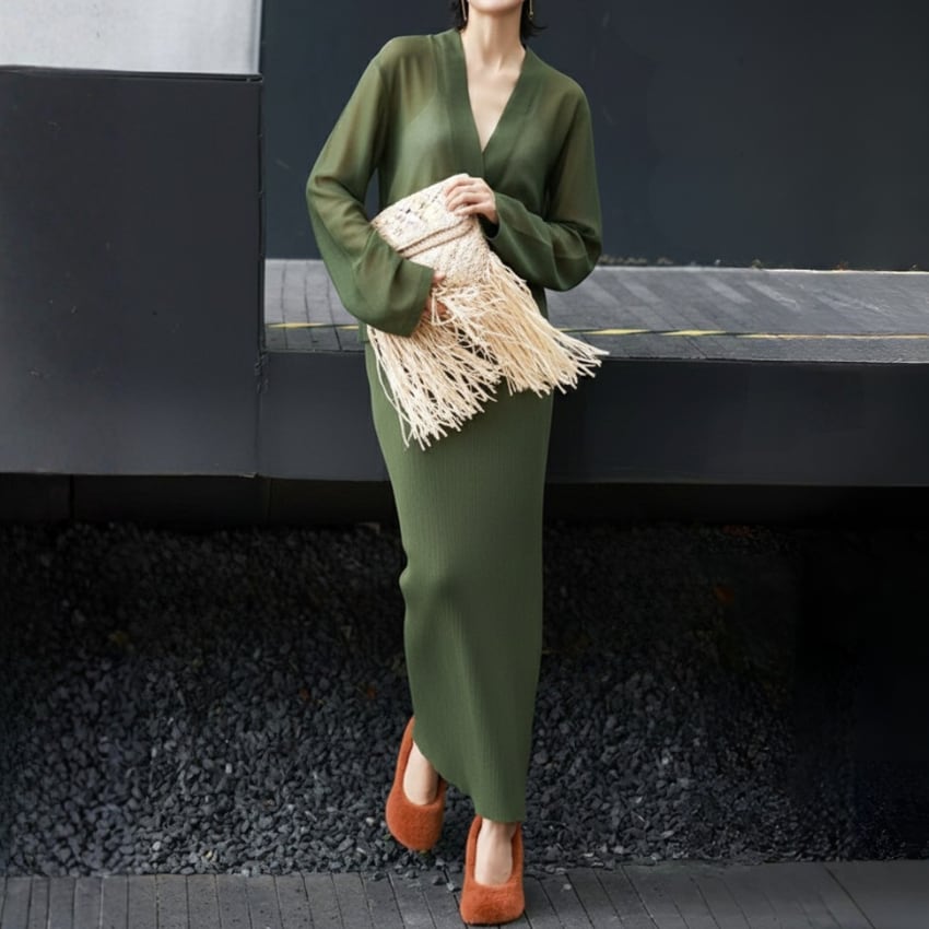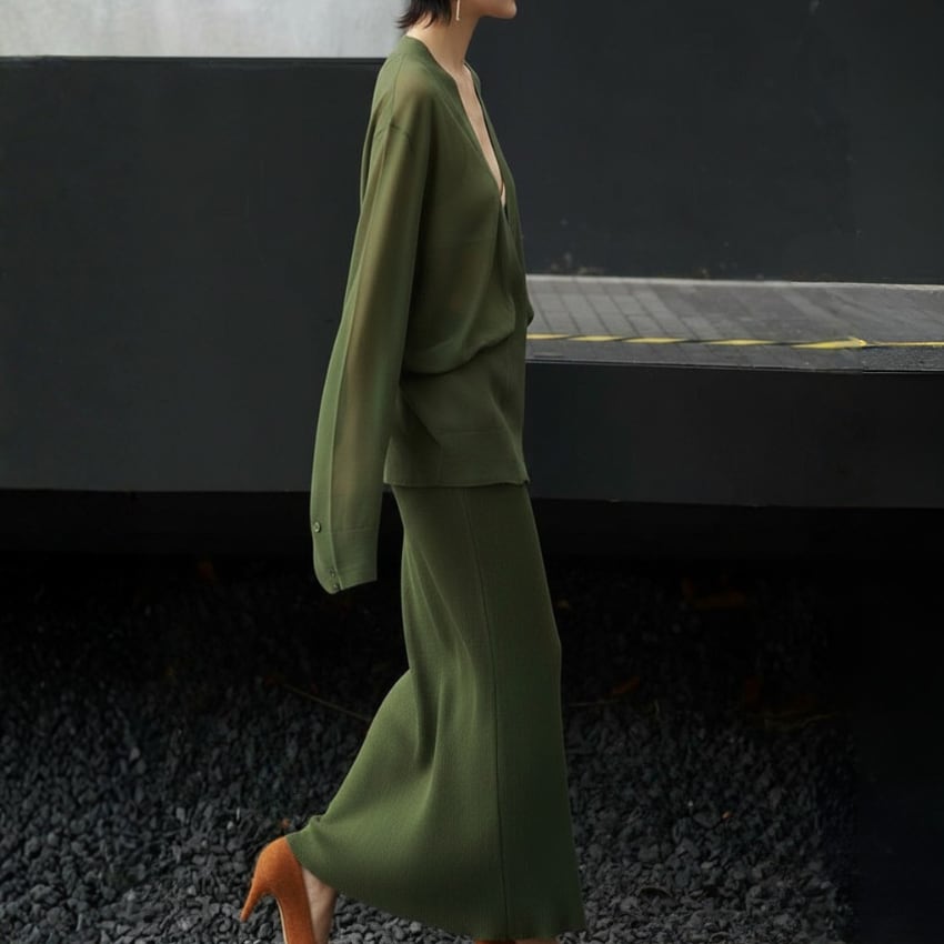 スタイリッシュVネックツーピースは、深いグリーンのVネックカーディガンとヒップハングのロングスカートがセットになった、洗練されたアイテムです。カーディガンのVネックデザインが顔周りを引き立て、スカートは女性らしいシルエットを演出します。カジュアルな日常からちょっとしたお出かけまで、どんなシーンでも自信を持って着こなせること間違いなしの一着です。こちらのツーピースをぜひあなたのワードローブに加えて、スタイリッシュなコーディネートを楽しんでみてはいかがでしょうか。