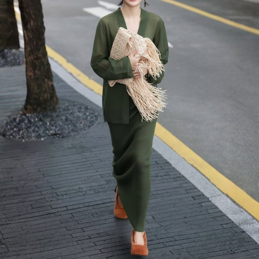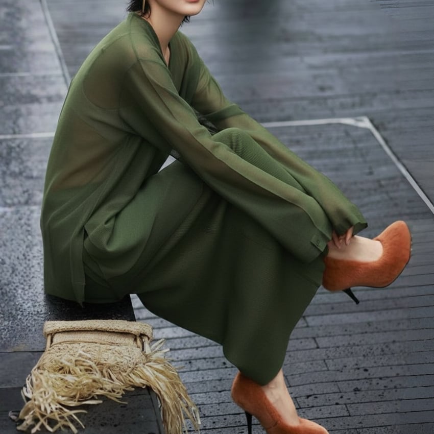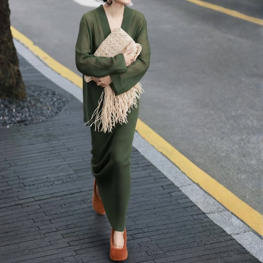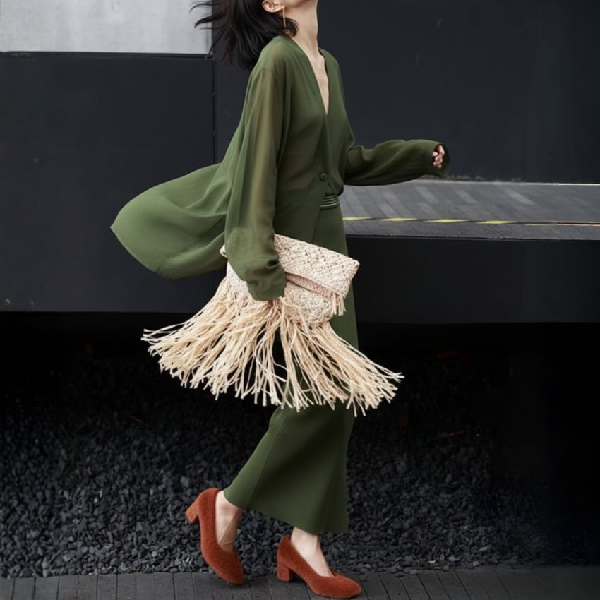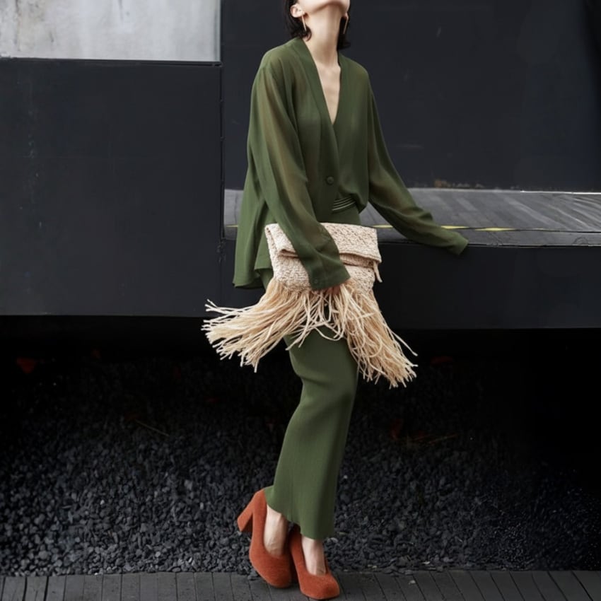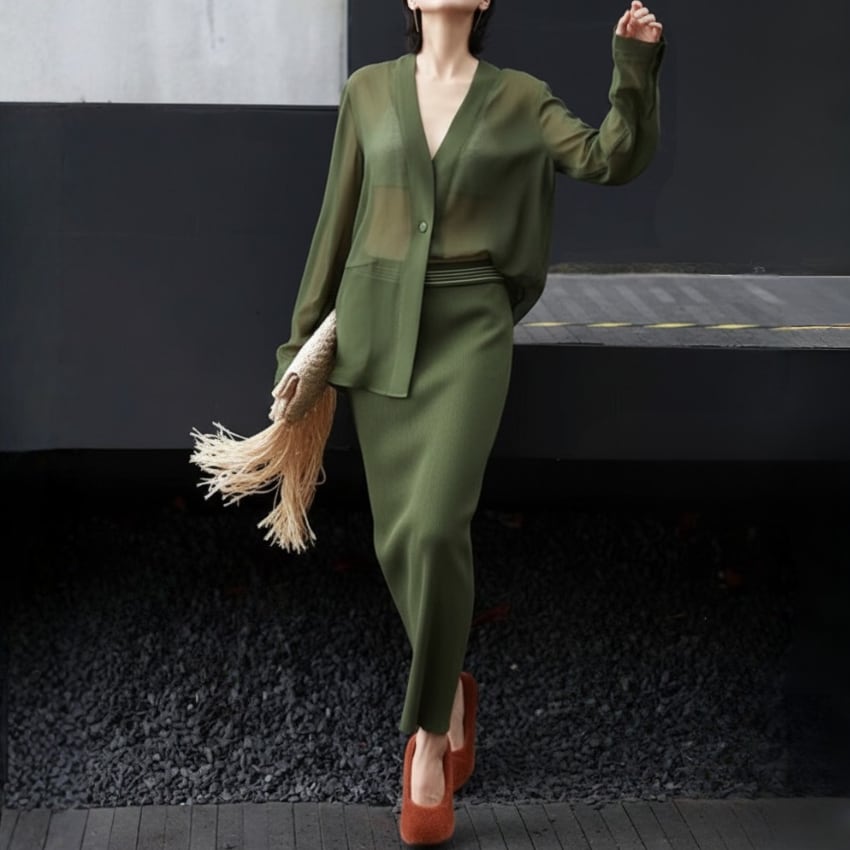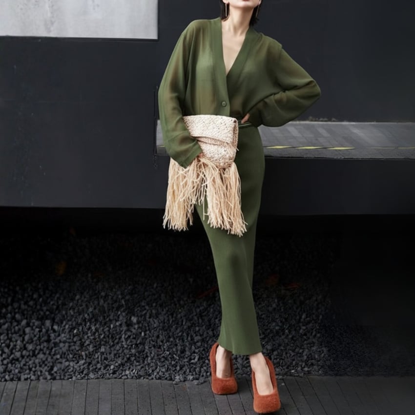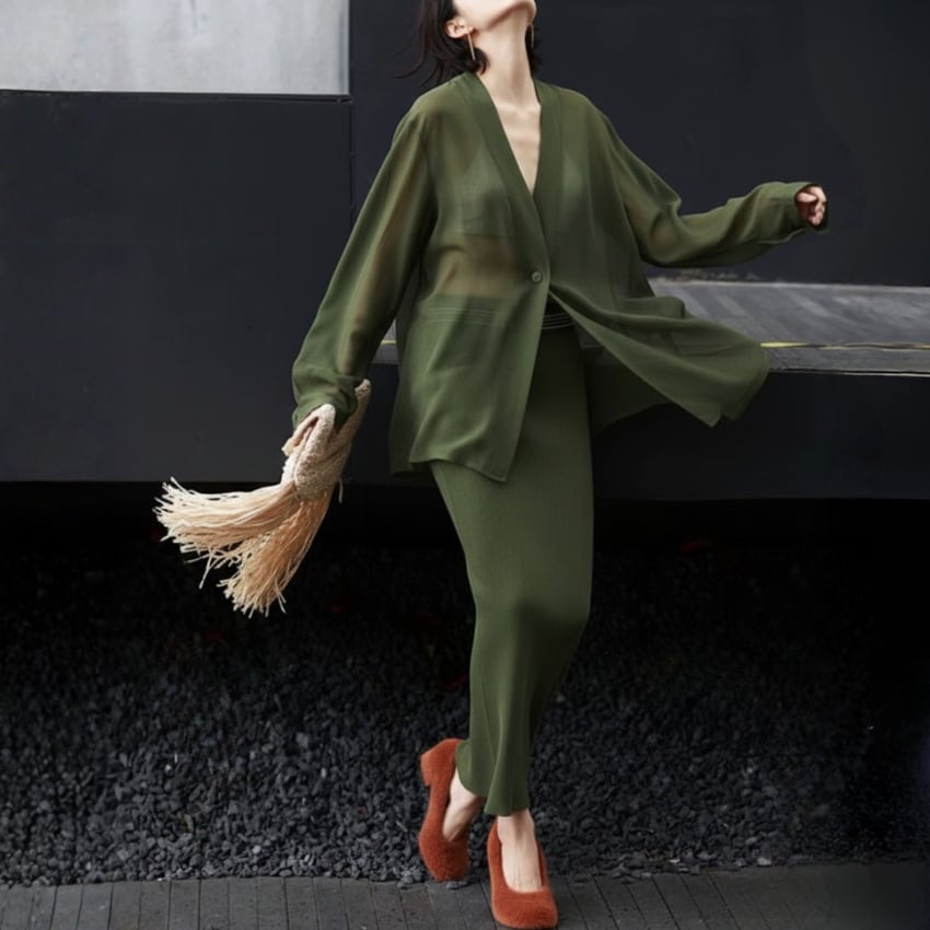 スタイリッシュVネックツーピースは、深いグリーンのVネックカーディガンとヒップハングのロングスカートがセットになった、洗練されたアイテムです。カーディガンのVネックデザインが顔周りを引き立て、スカートは女性らしいシルエットを演出します。カジュアルな日常からちょっとしたお出かけまで、どんなシーンでも自信を持って着こなせること間違いなしの一着です。こちらのツーピースをぜひあなたのワードローブに加えて、スタイリッシュなコーディネートを楽しんでみてはいかがでしょうか。