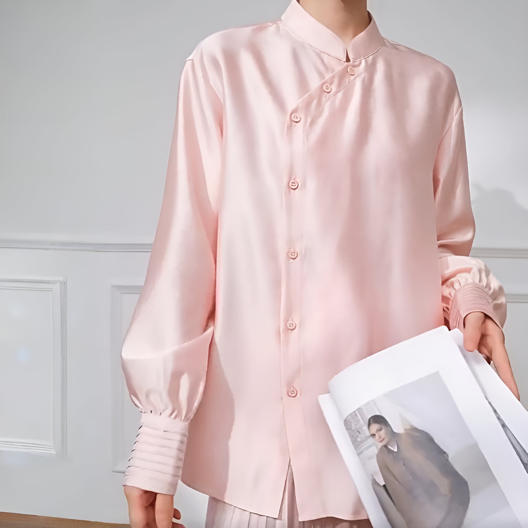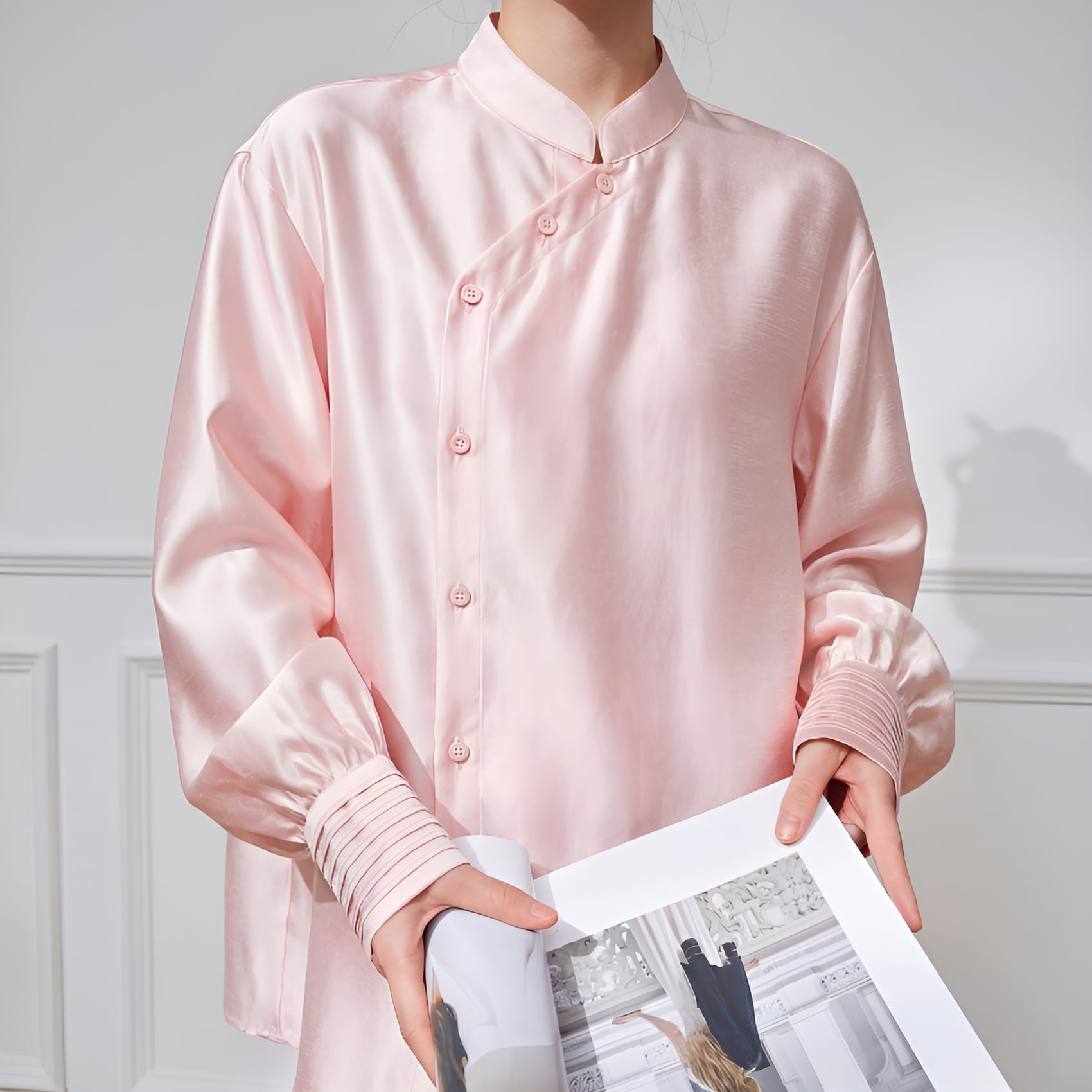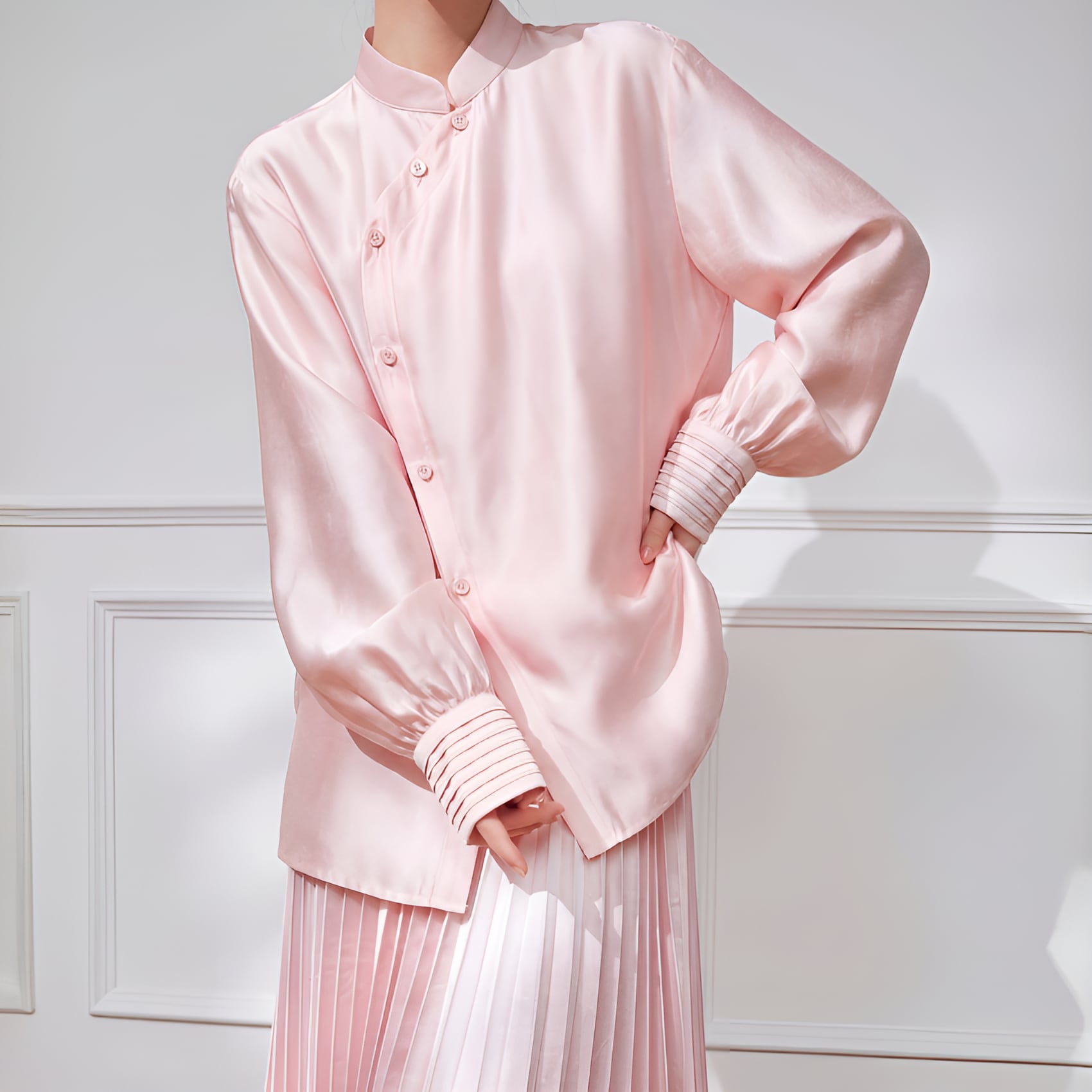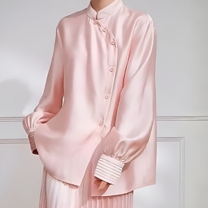 アシンメトリーカラー スタンドレトロブラウスは、ピンクの柔らかな色合いと独自のデザインが魅力の一着です。アシンメトリーなカラーがセンスを感じさせ、スタンドカラーが首元を華やかに演出します。流れるようなシルエットが女性らしさを引き立てつつ、カジュアルからフォーマルまで、さまざまなシーンにお使いいただけるアイテムです。ぜひ、こちらの素敵なブラウスをあなたのワードローブに加えて、おしゃれを楽しんでみてはいかがでしょうか。
