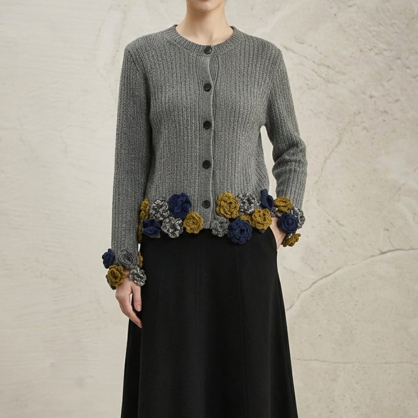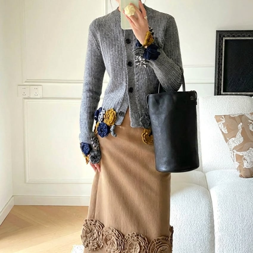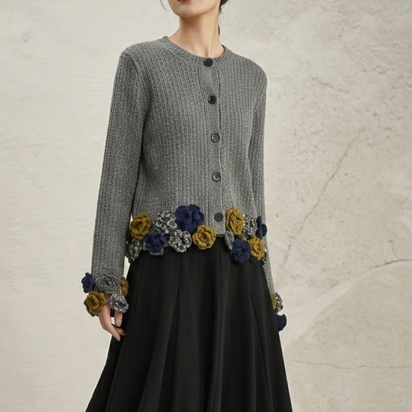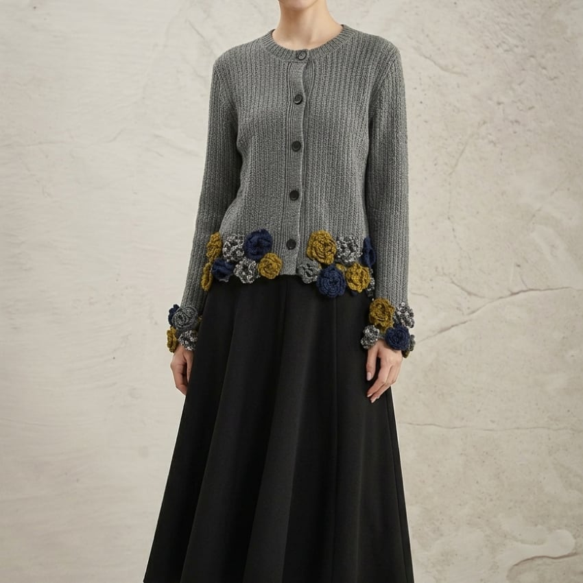 デザイナーカメリアニットカーディガンは、グレーを基調としたフレンチスタイルの魅力的なアイテムです。立体的な花柄の裾が特徴的で、上品さとエレガンスを兼ね備えています。カーディガンは、ゆったりとしたシルエットでリラックスした着心地を実現し、さまざまなコーディネートに活躍します。こちらのカーディガンをワードローブに取り入れ、特別な瞬間をより一層引き立てていただければと思います。