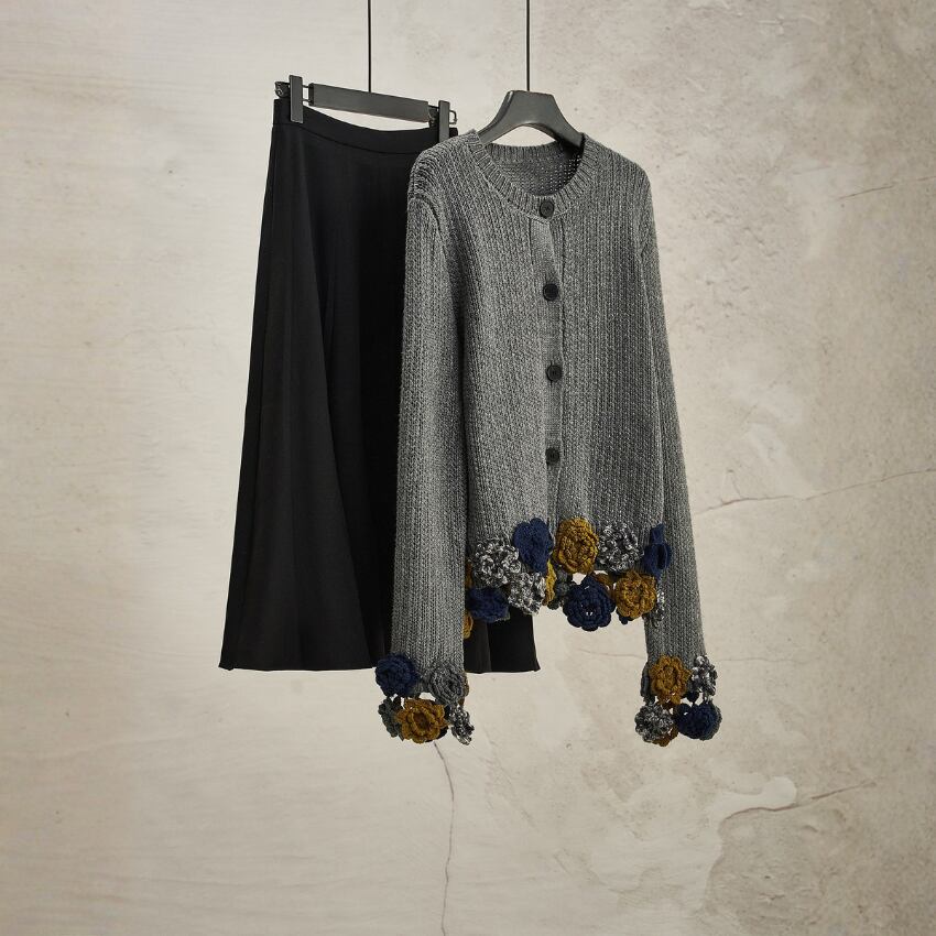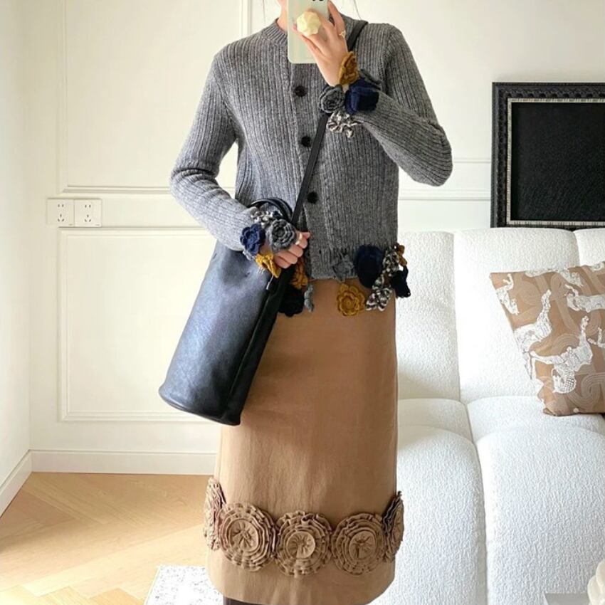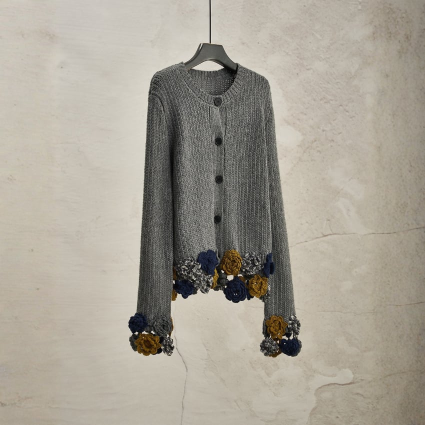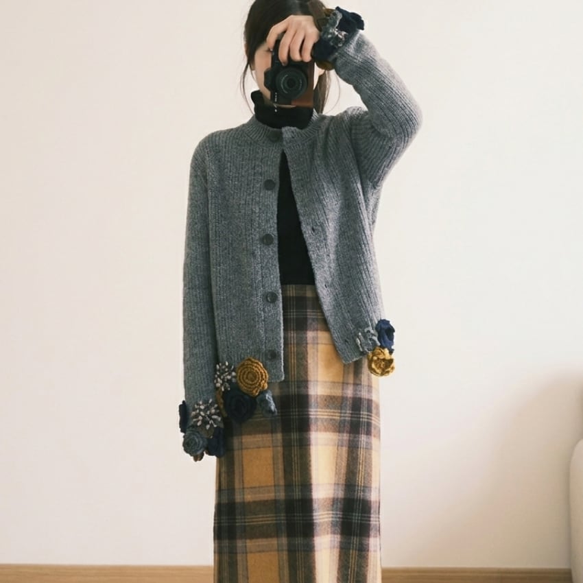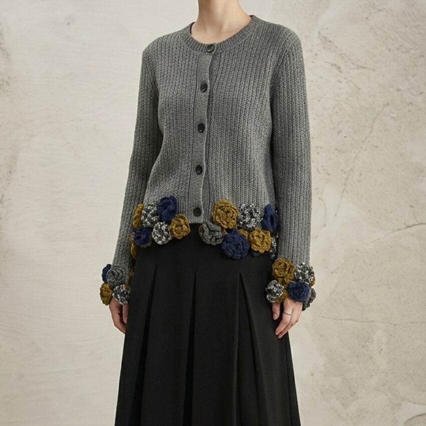 デザイナーカメリアニットカーディガンは、グレーを基調としたフレンチスタイルの魅力的なアイテムです。立体的な花柄の裾が特徴的で、上品さとエレガンスを兼ね備えています。カーディガンは、ゆったりとしたシルエットでリラックスした着心地を実現し、さまざまなコーディネートに活躍します。こちらのカーディガンをワードローブに取り入れ、特別な瞬間をより一層引き立てていただければと思います。