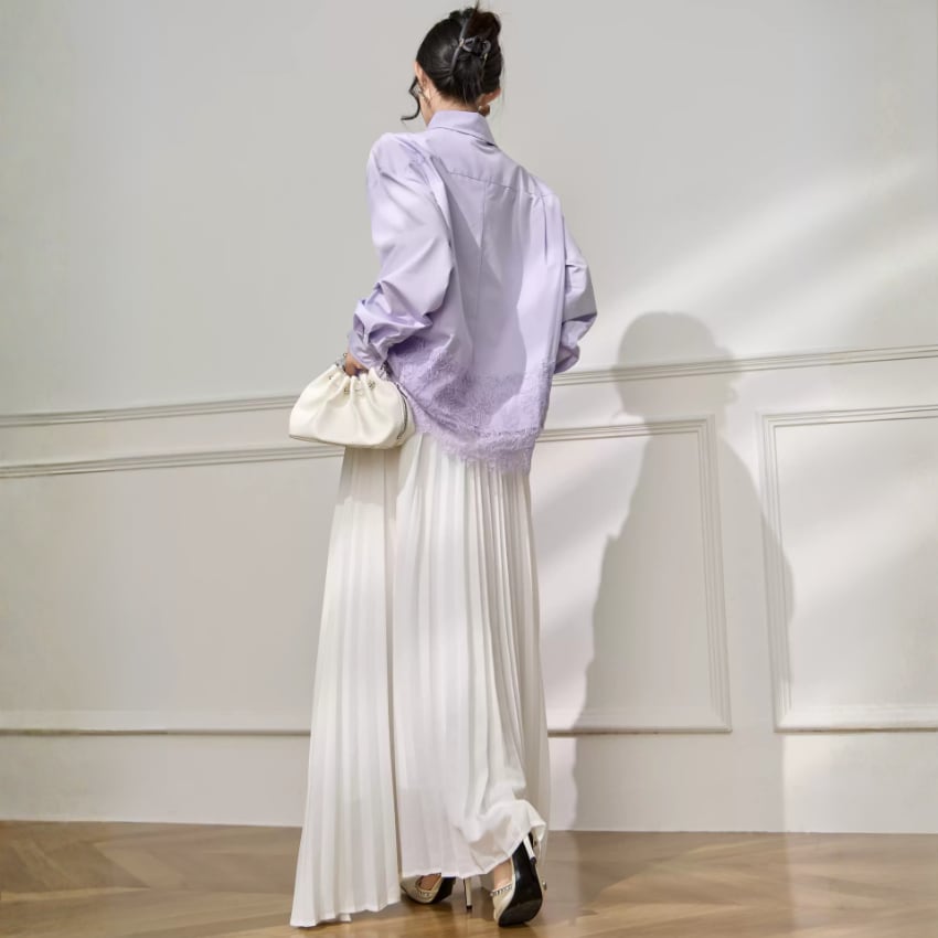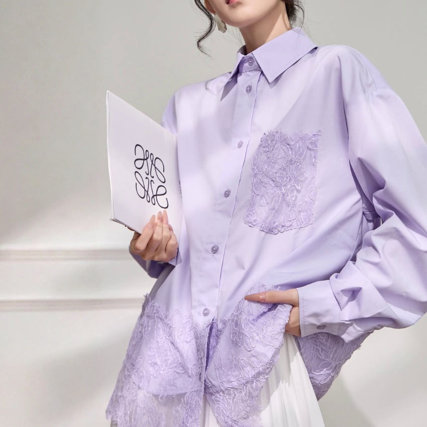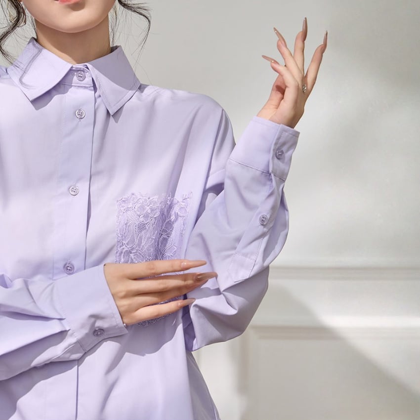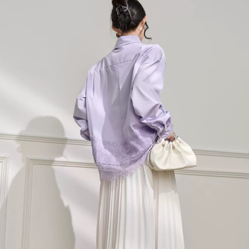 レーストリムフレンチスタイルシャツは、優雅なパープルの色合いが特徴的な一枚です。フレンチスタイルが際立つデザインと、レーストリムが女性らしさを引き立て、エレガントな印象を与えます。ソフトな素材感は、着心地の良さとリラックスした雰囲気を両立させ、日常のコーディネートから特別なシーンまで幅広く活躍することでしょう。ぜひ、その魅力を実感していただきたい素敵なシャツです。