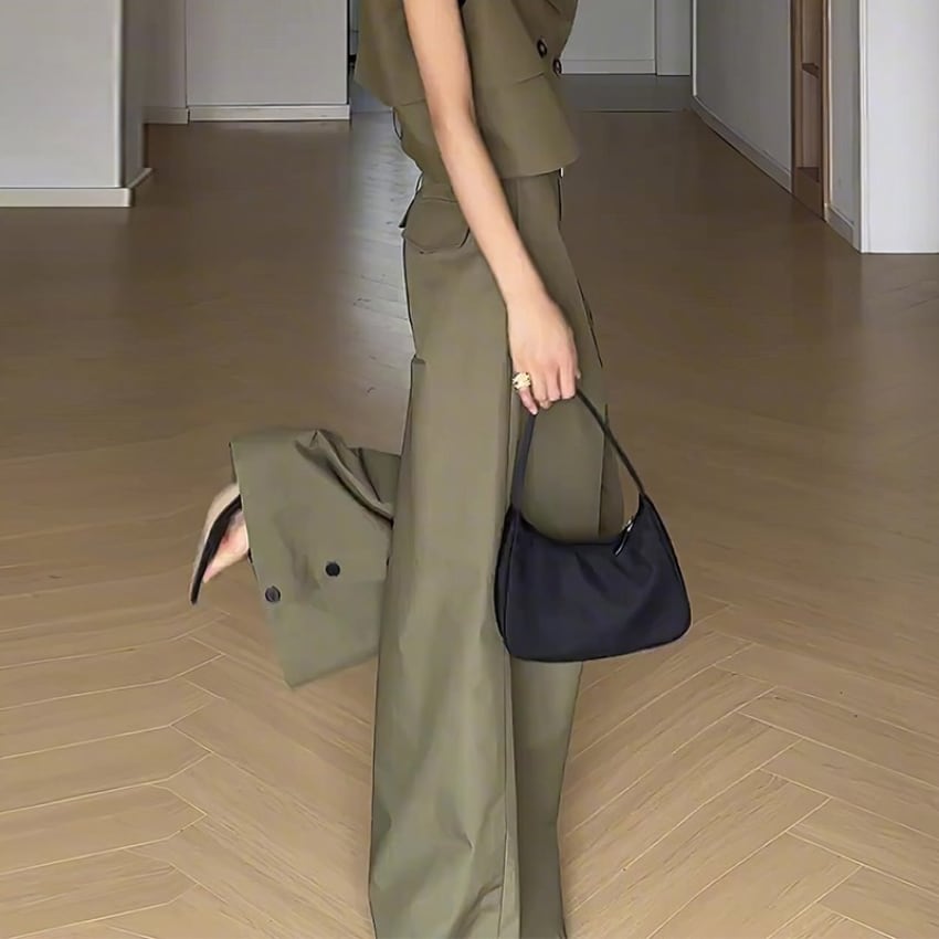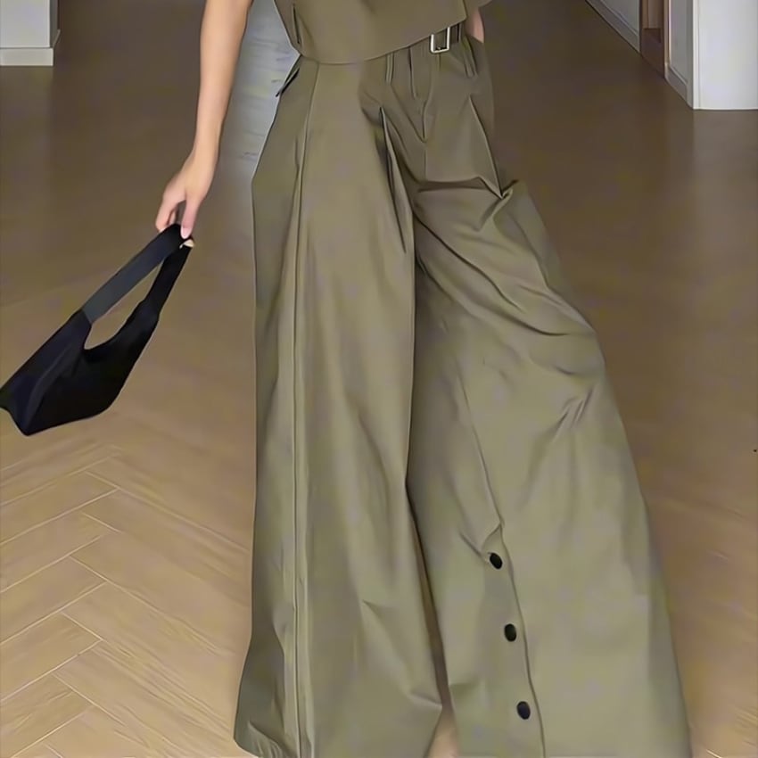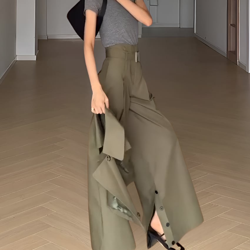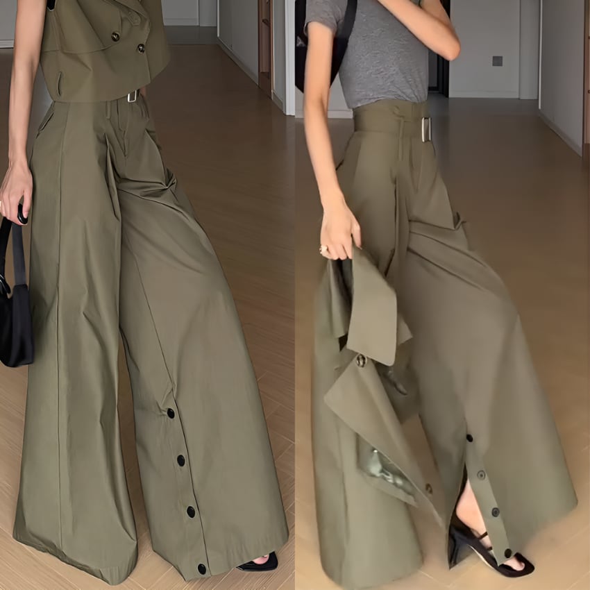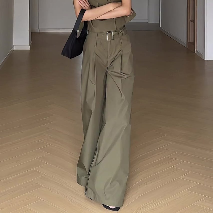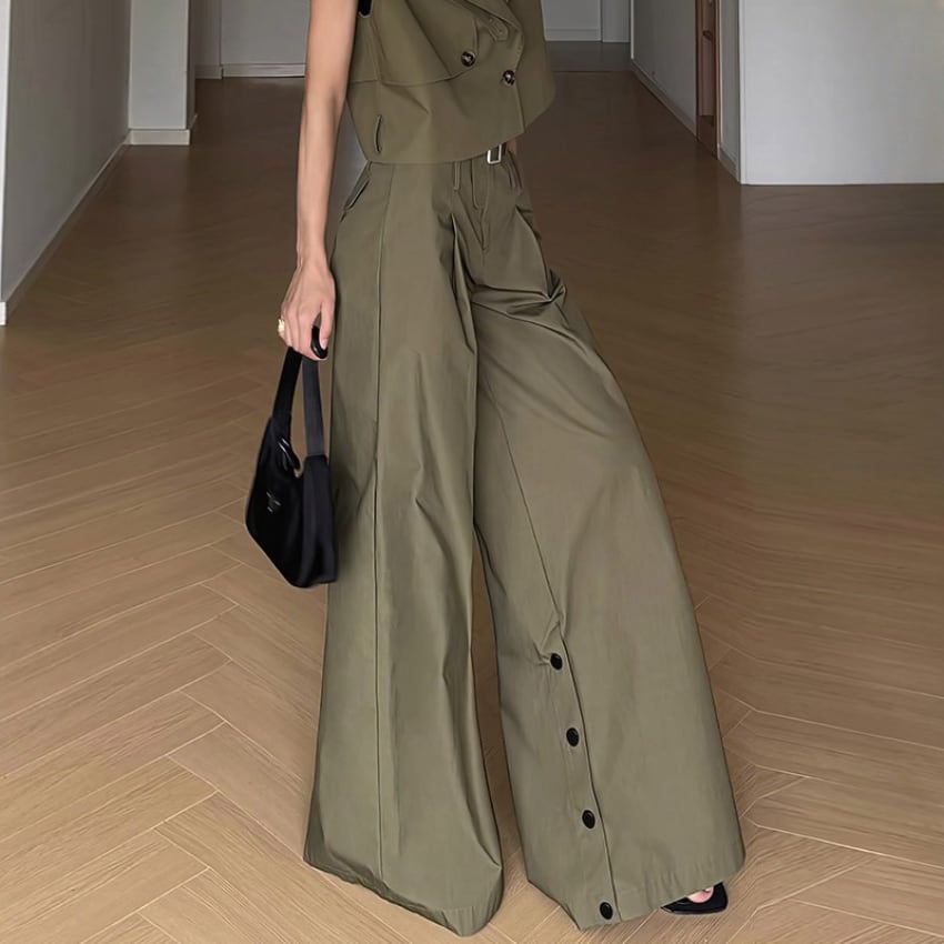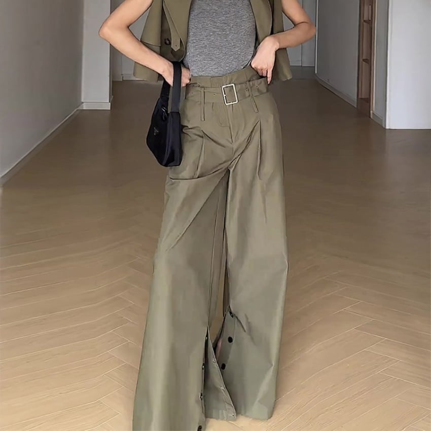 アーミーグリーンハイウエストスリット入りワイドレッグパンツ BM1355