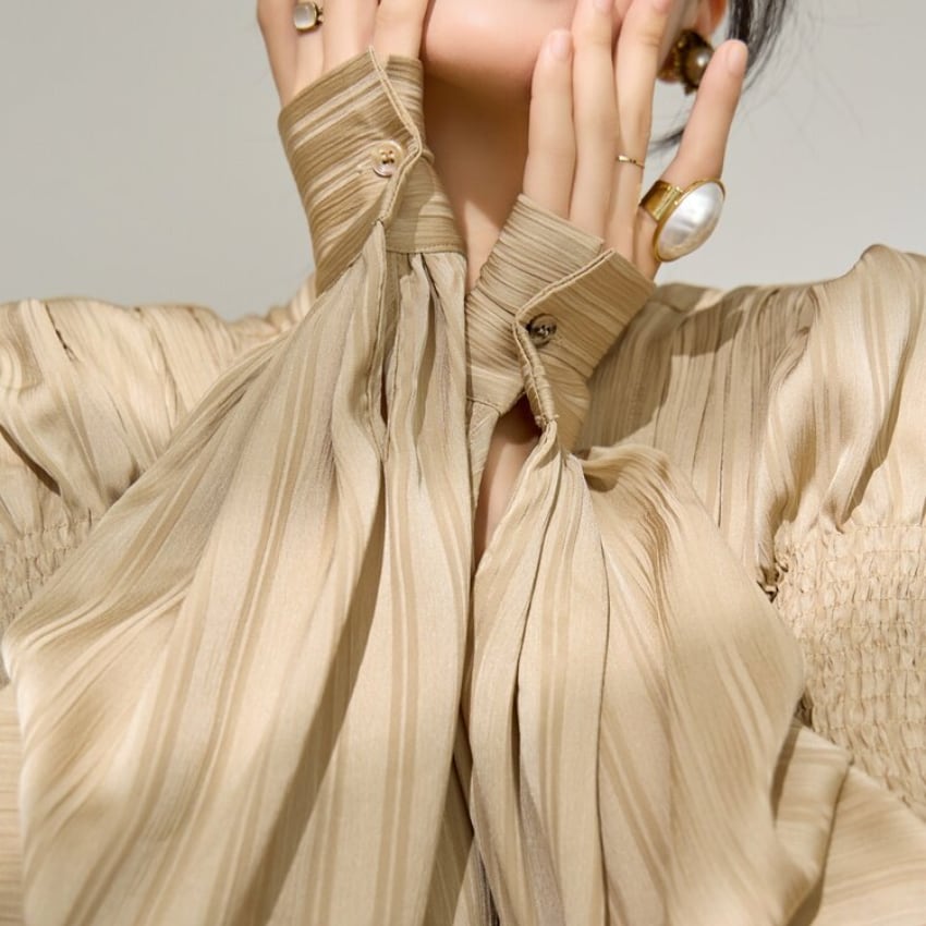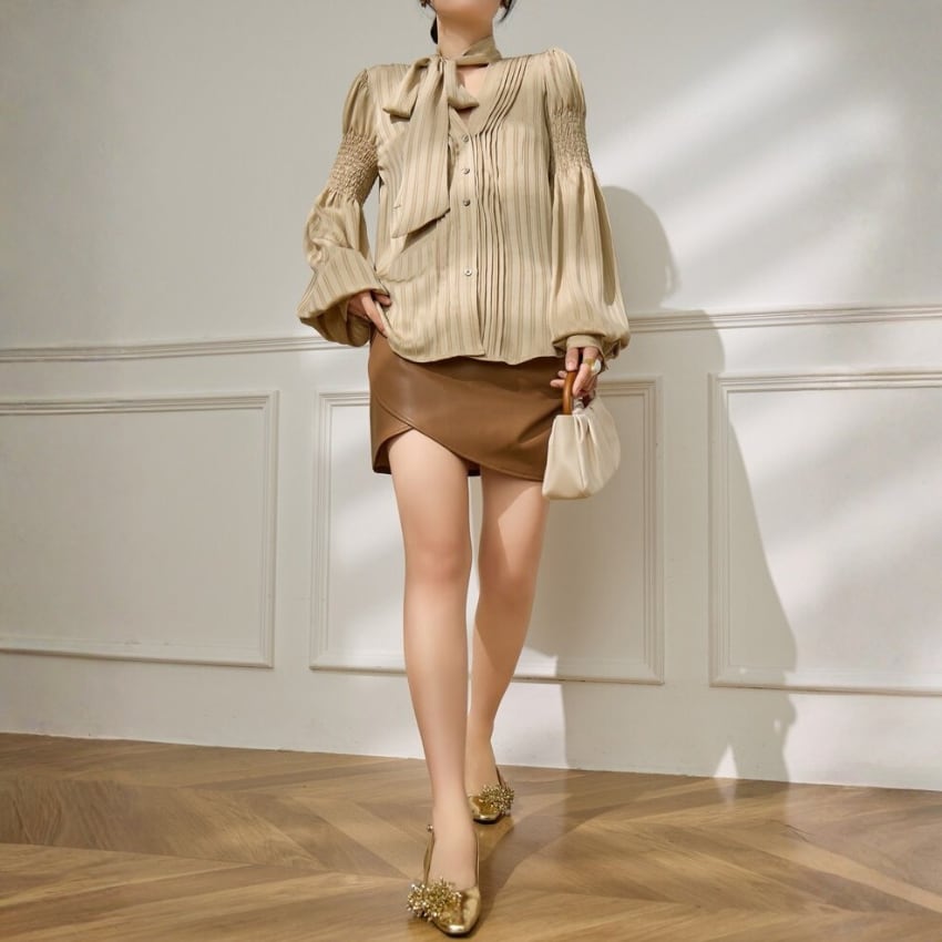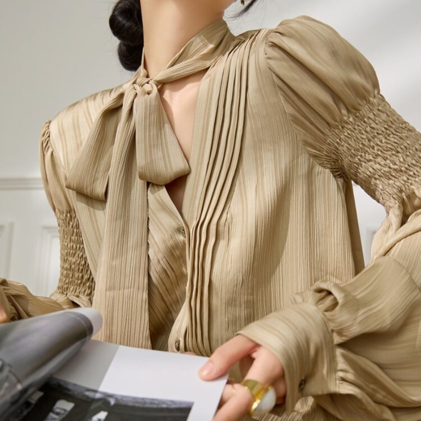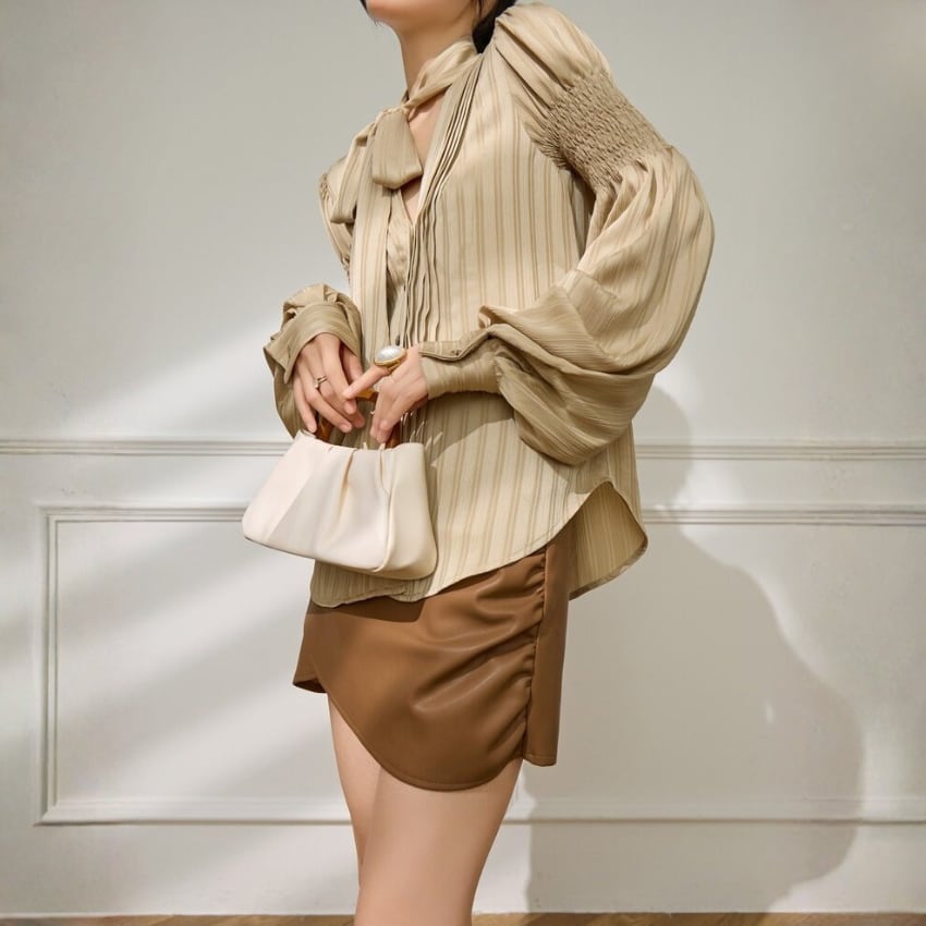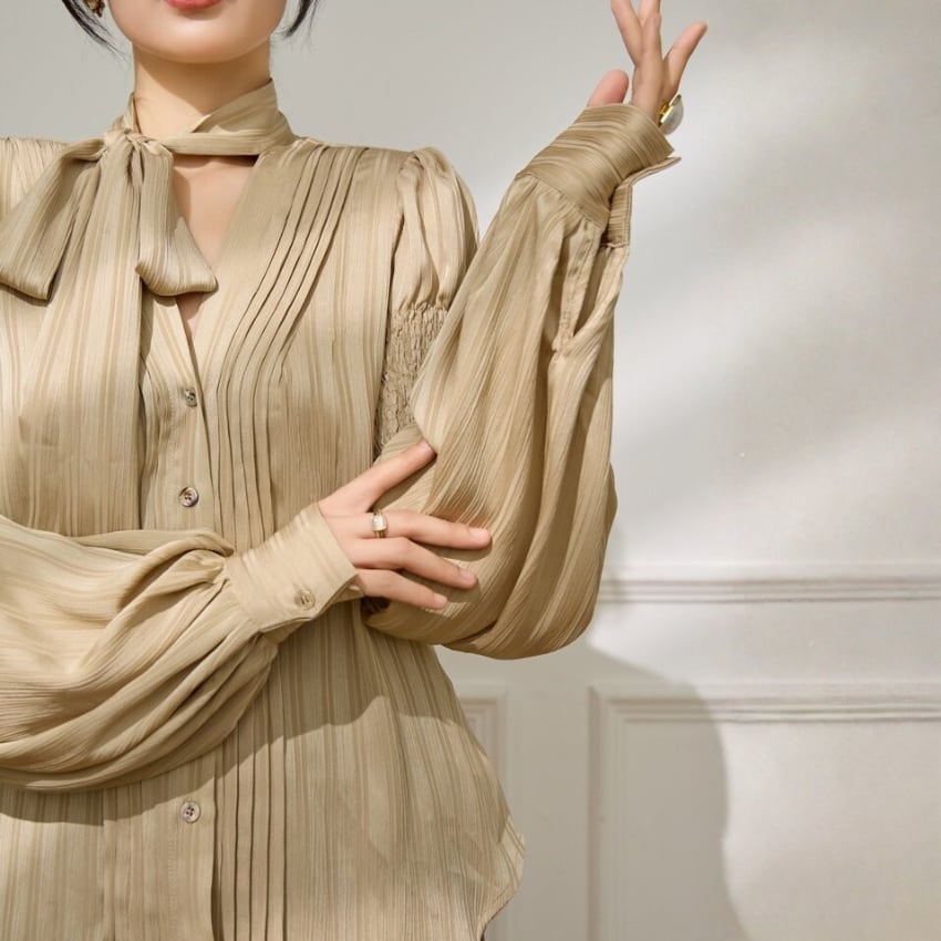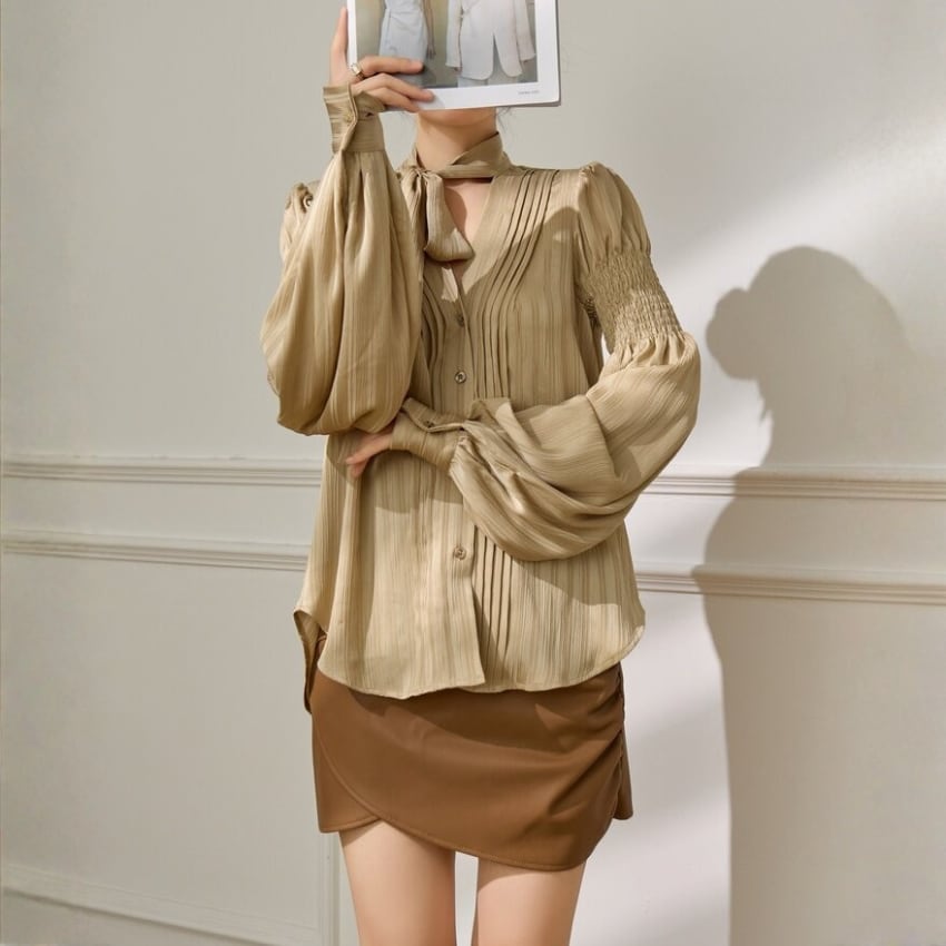 フレンチスタイルギャザー入りランタンスリーブリボンブラウス BM1356
