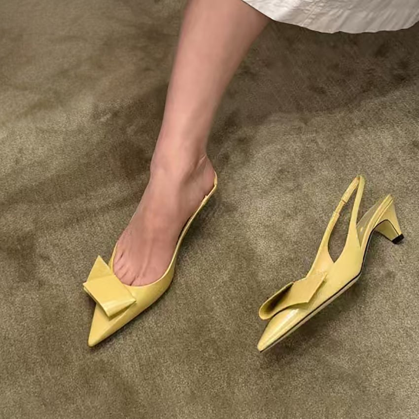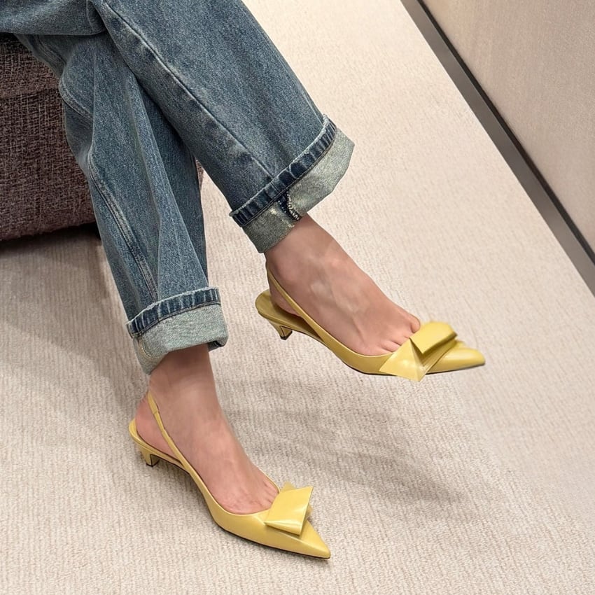 リボンが特徴的なポインテッドトゥパンプスは、あなたの足元をより美しく引き立てます。ポインテッドトゥのデザインは足を細く長く見せる効果があり、スタイルアップも期待できます。バックストラップ付きで安定感があり、快適な履き心地を提供します。カジュアルなデニムスタイルから、きれいめなスカートスタイルまで、幅広いコーディネートに合わせやすいアイテムです。