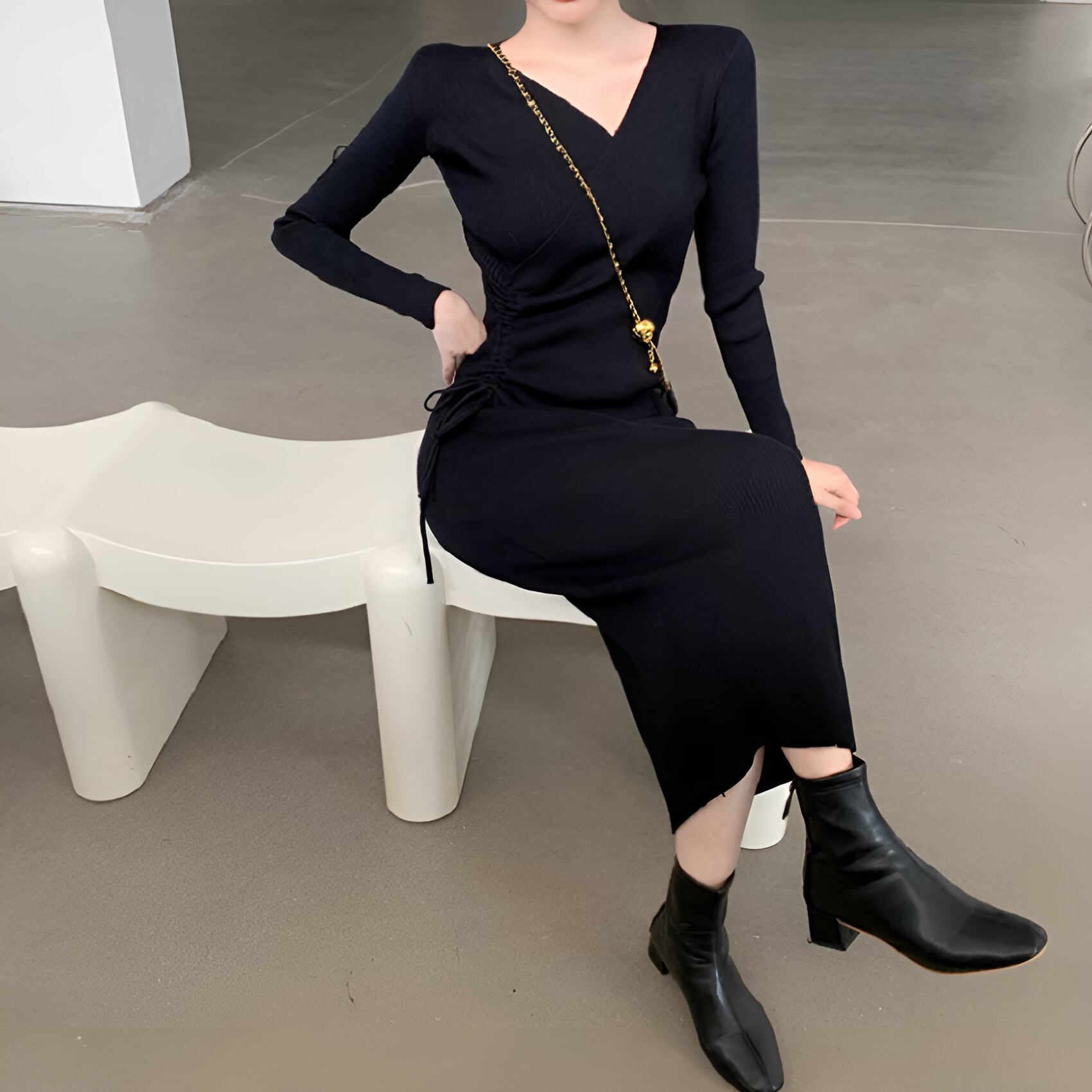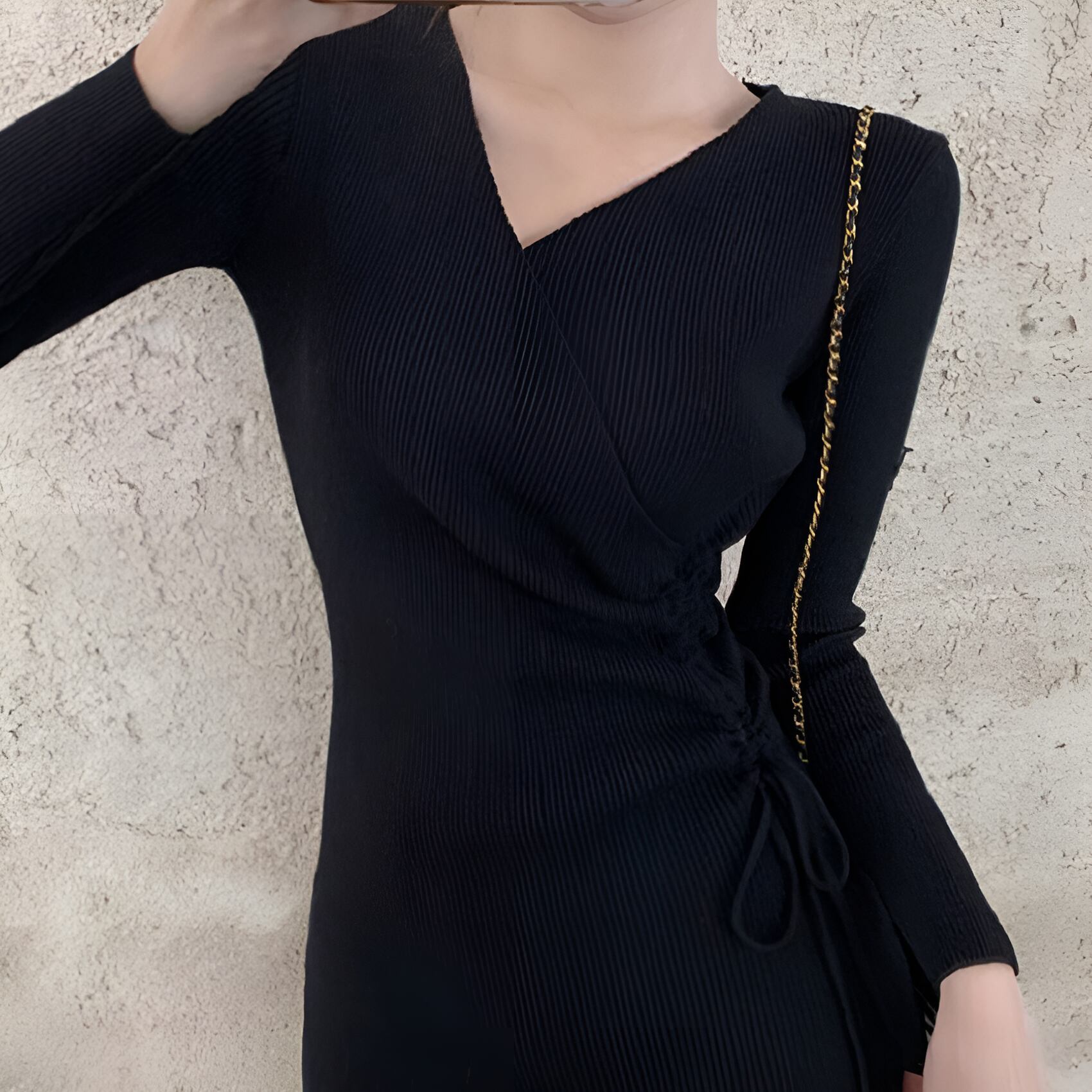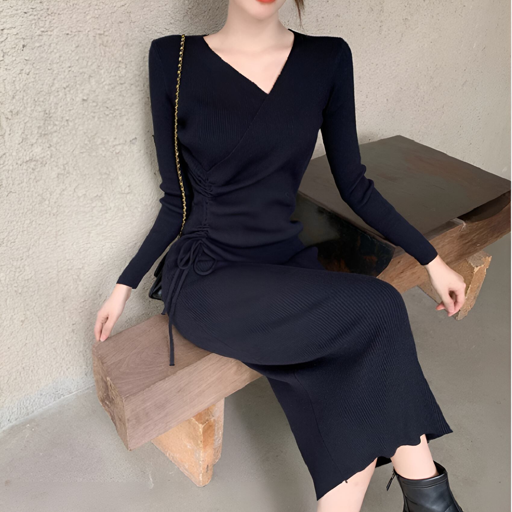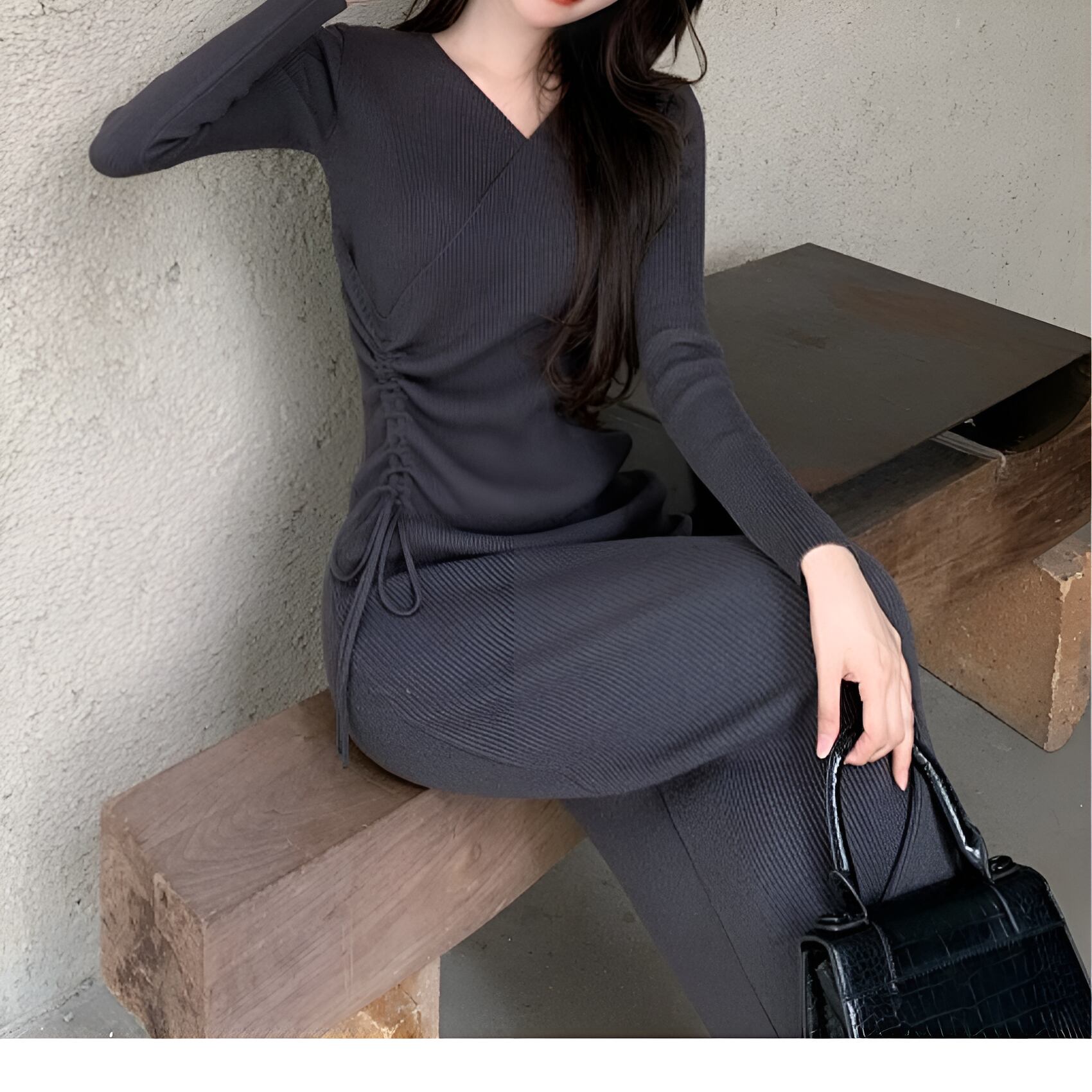 大人っぽい雰囲気漂うVネックスリムレースアップニットワンピースになります。女性らしいシルエットが美しくスタイリッシュさも兼ね備えています。バスト周りのレースアップデザインがポイントで、適度な肌見せで大人の色香を演出。ひざ上丈のスカートラインが脚長効果もあり細見え効果も期待できます。