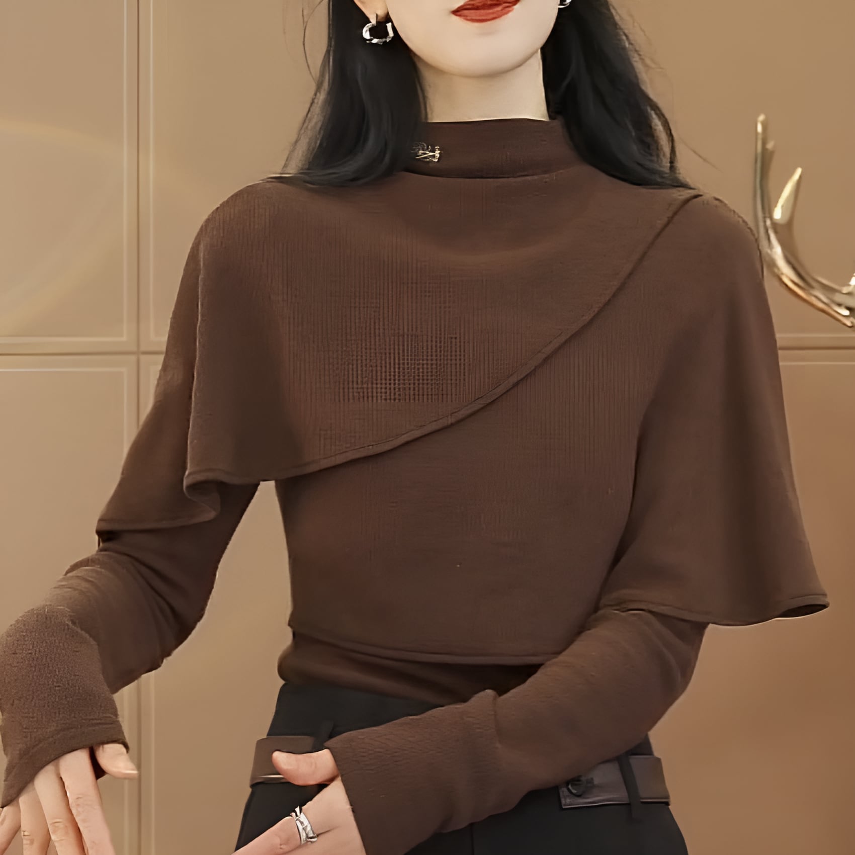 ケープスタイルのフリルエッジが特徴のハーフタートルネックになります。まるで羽織っているかのような風合いが楽しめます。さらに、華やかな印象を与えるハイネックデザインで、首元を引き立てます。ドレッシーコーディネートにもカジュアルコーディネートにもマッチし、おしゃれ度をアップさせます。