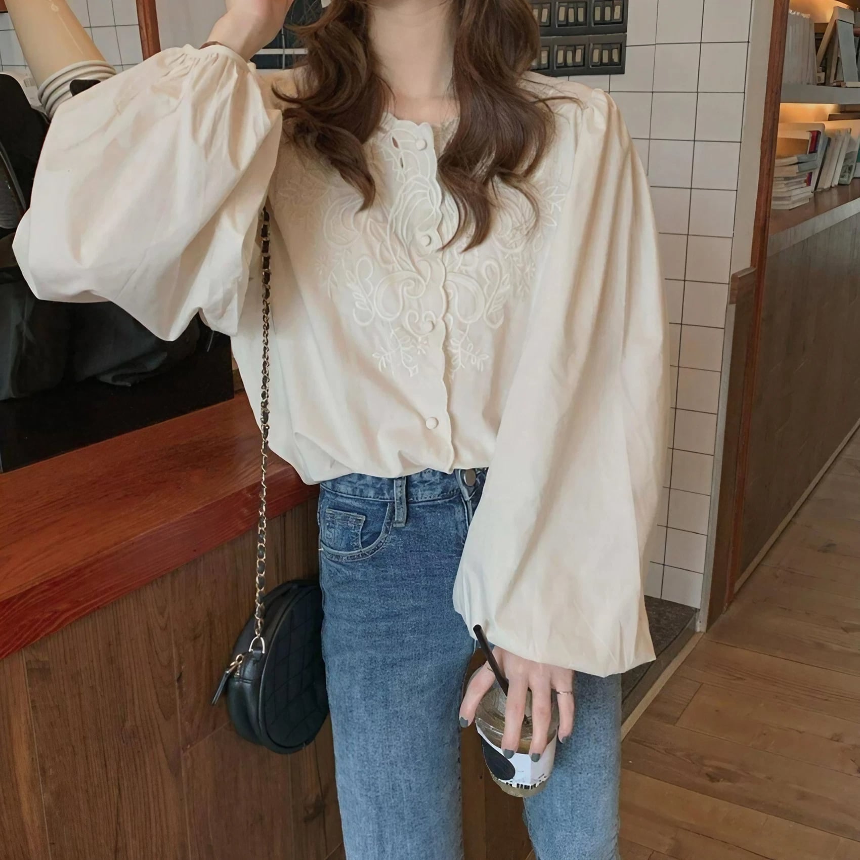 刺繍レースが上品な輝きを放つ、ランタンスリーブシャツになります。柔らかな素材が肌触り良く、涼やかで清涼感のある着こなしにぴったりです。フェミニンな雰囲気漂う刺繍レースが、シンプルなシャツを一気に華やかに演出。袖口のランタンスリーブデザインで、動きに合わせて揺らめく煌めきが女性らしさを引き立てます。
