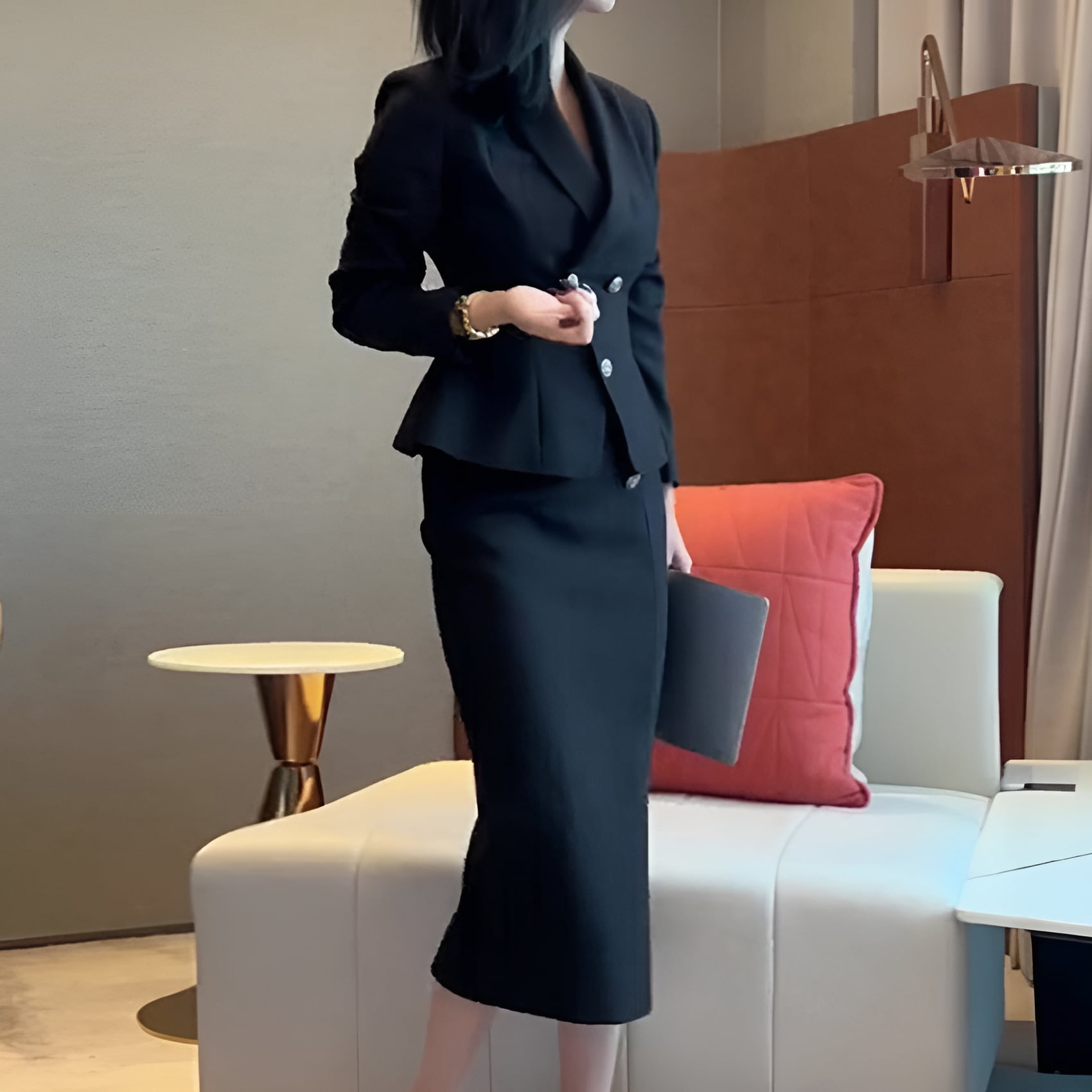 エレガントな雰囲気漂うハイエンドオフィススーツスカートになります。シンプルでありながら、上品でクラシカルなデザインが特徴です。洗練されたスタイルを身に纏い、仕事のプロフェッショナルな雰囲気を演出する一着。シルエットは美しく、動きやすさも考慮されています。スタイリッシュなシルエットが、職場でのビジネスシーンをさりげなく引き立てます。
