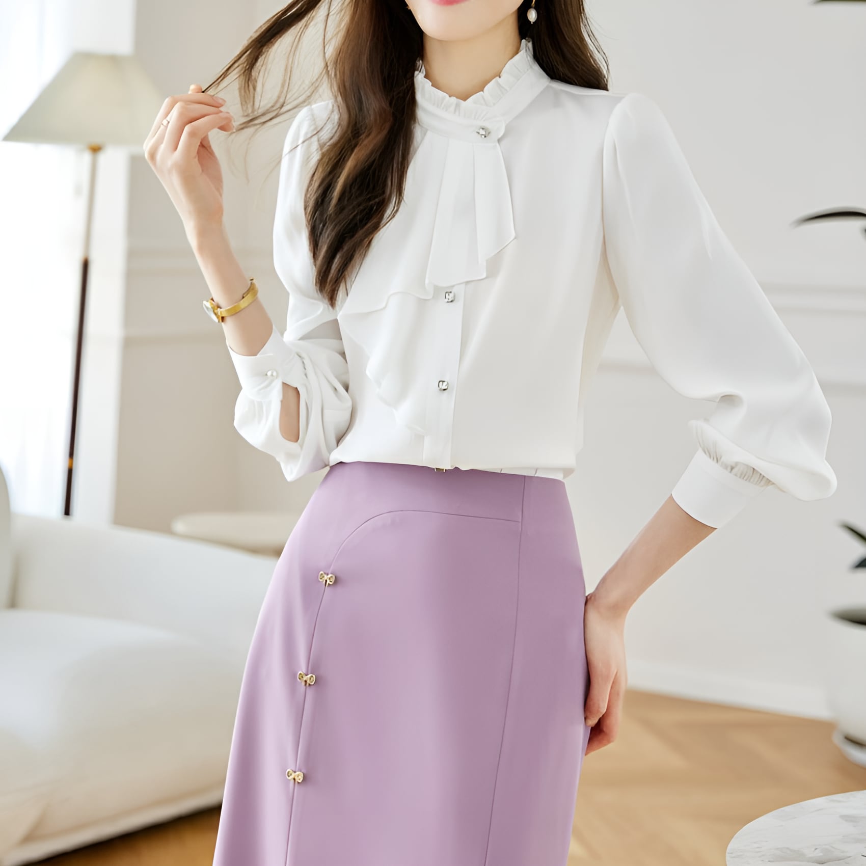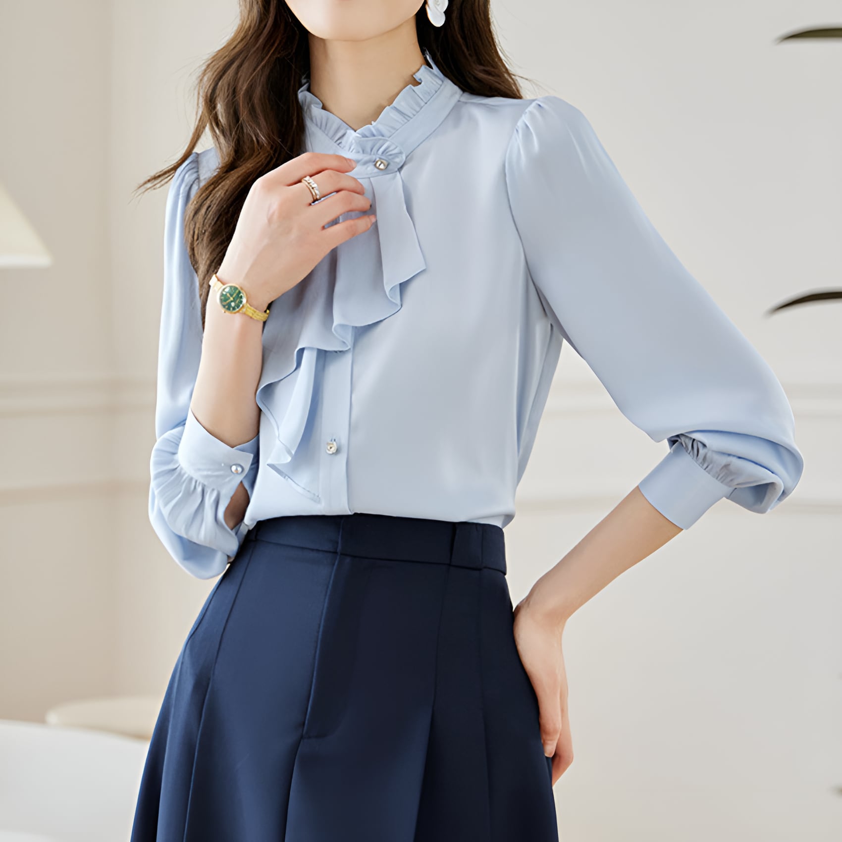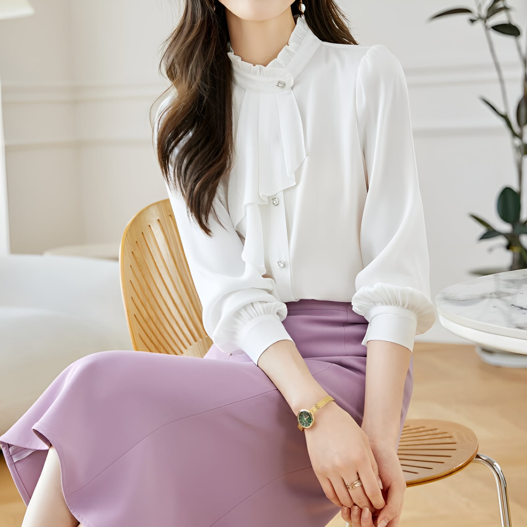 シフォン素材の軽やかさとエレガントなデザインが融合したフレンチシック シフォンブラウスになります。ヨーロッパの伝統的なデザインを現代風にアレンジした一枚は、まるでパリジェンヌのような気品漂うアイテムです。シフォン素材の透け感と軽やかな風合いが女性らしさを引き立て、優雅なシルエットが着る人の魅力をグッと引き立てます。