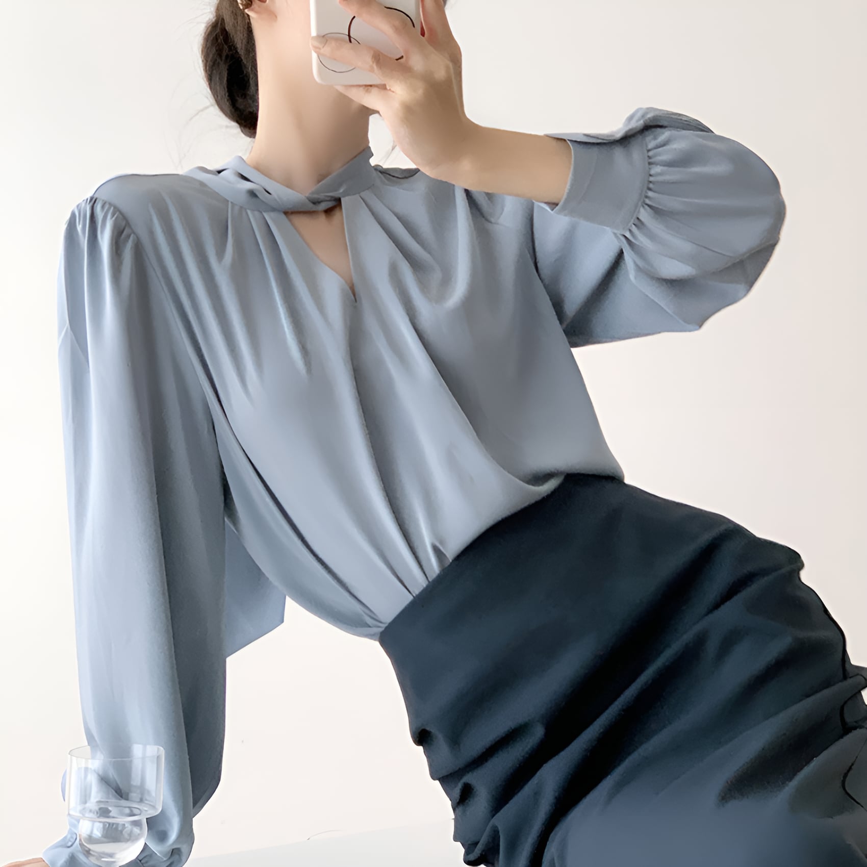 スマートでエレガントなヘイズブルーツイストリボンが特徴のプロフェッショナルシャツ。ビジネスシーンからパーティーやイベントまで、多彩なシーンで活躍する洗練されたデザインが魅力です。ツイストリボンが上品なアクセントとなり、華やかさを演出します。