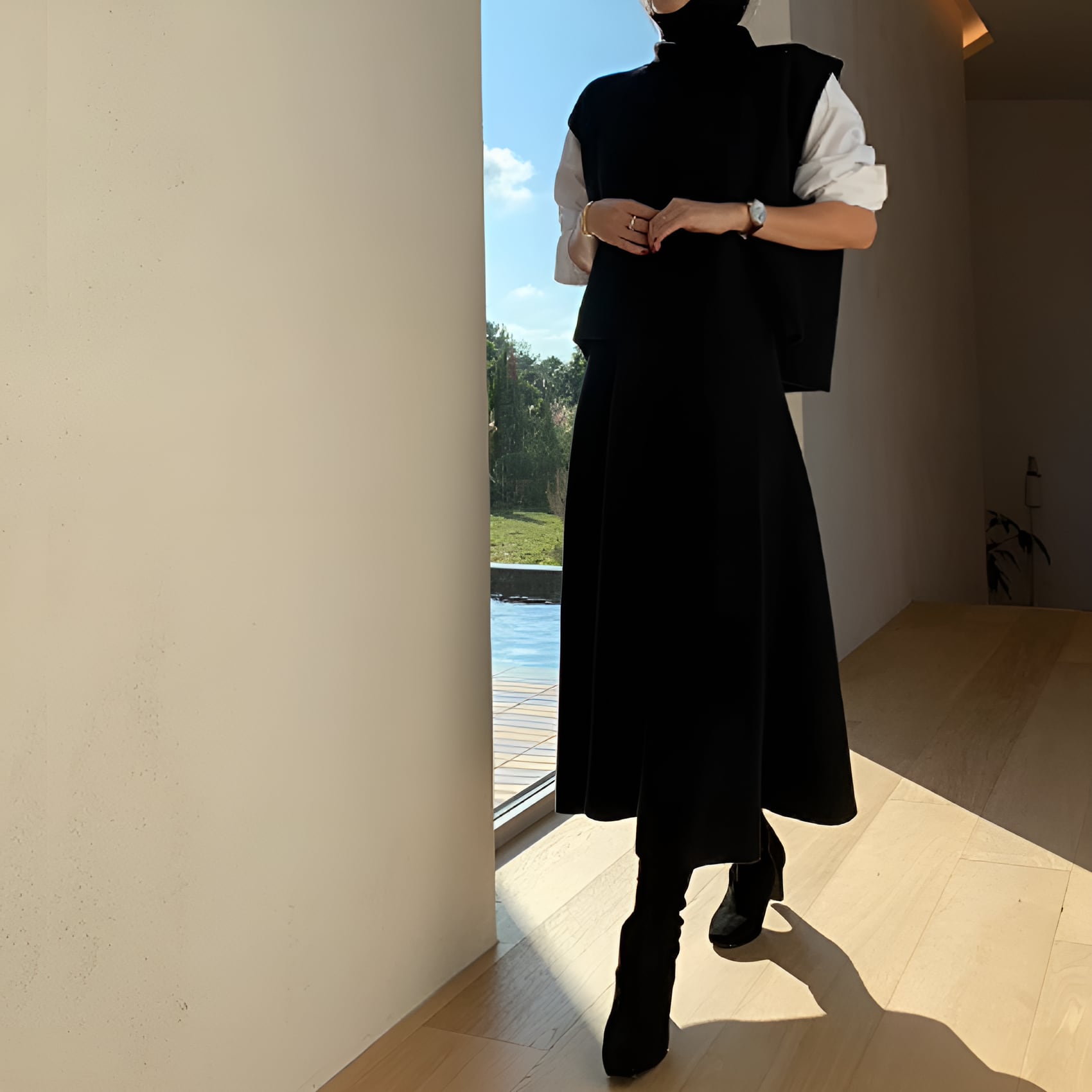 華やかなデザインでおしゃれなセットアップが完成するシックハイカラースリットセーターベスト&ハイウエストAラインスカート。トレンド感溢れるハイネックのベストがお洒落な印象を与え、スリット入りで動きやすさも抜群です。ハイウエストのAラインスカートは脚長効果抜群で、美しいシルエットを作り出します。