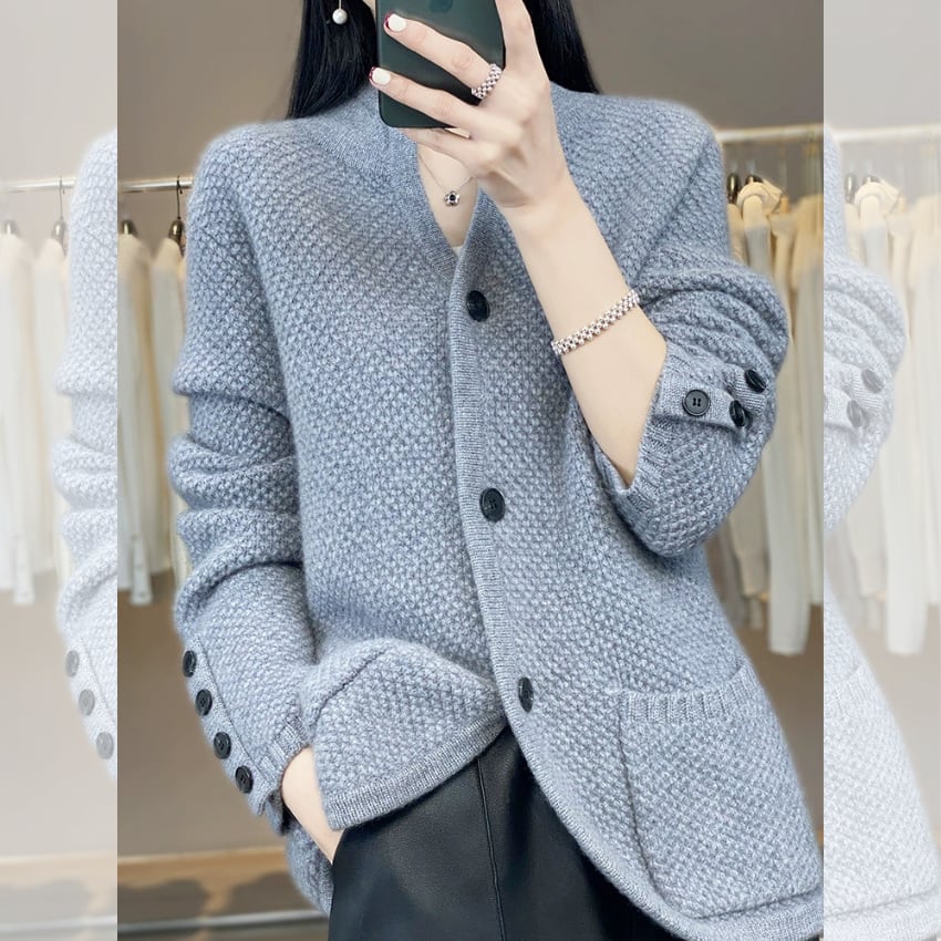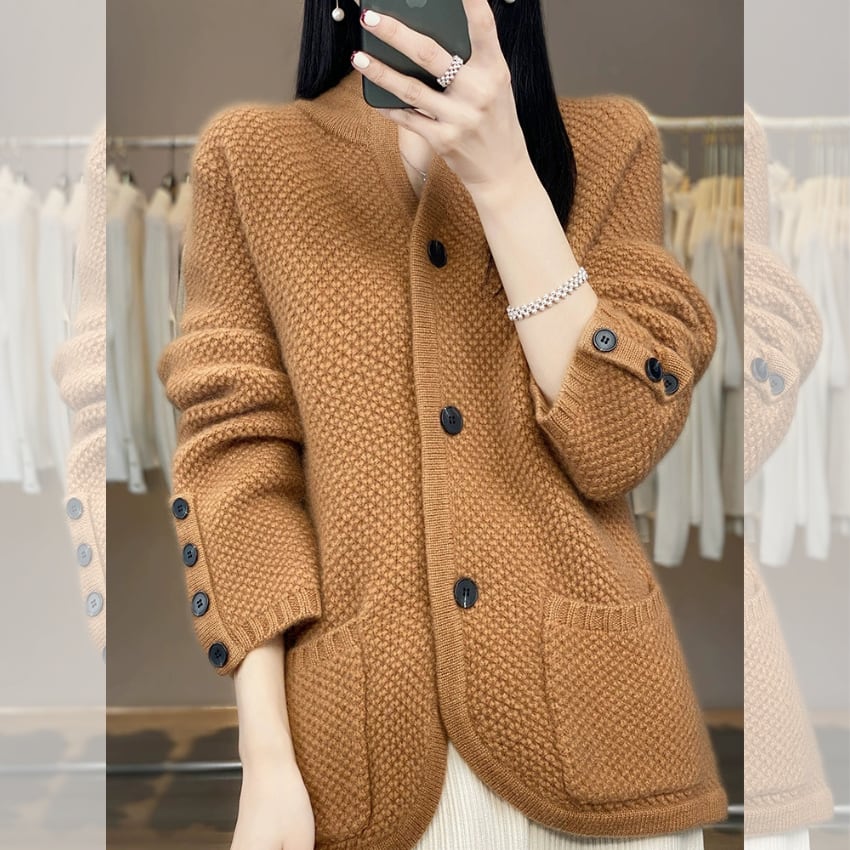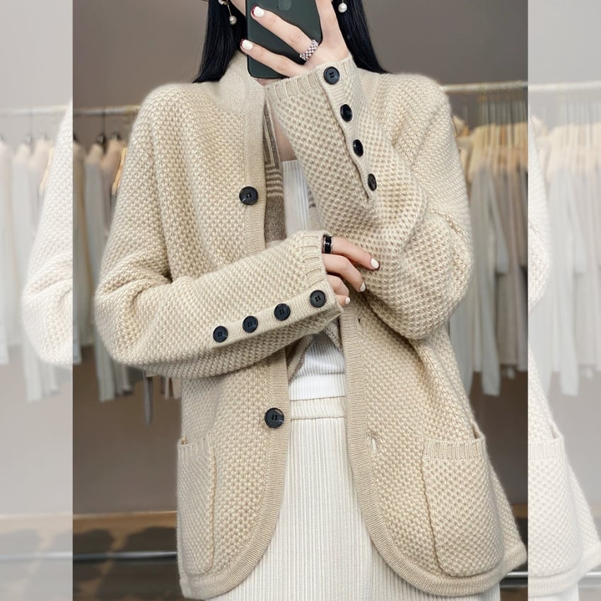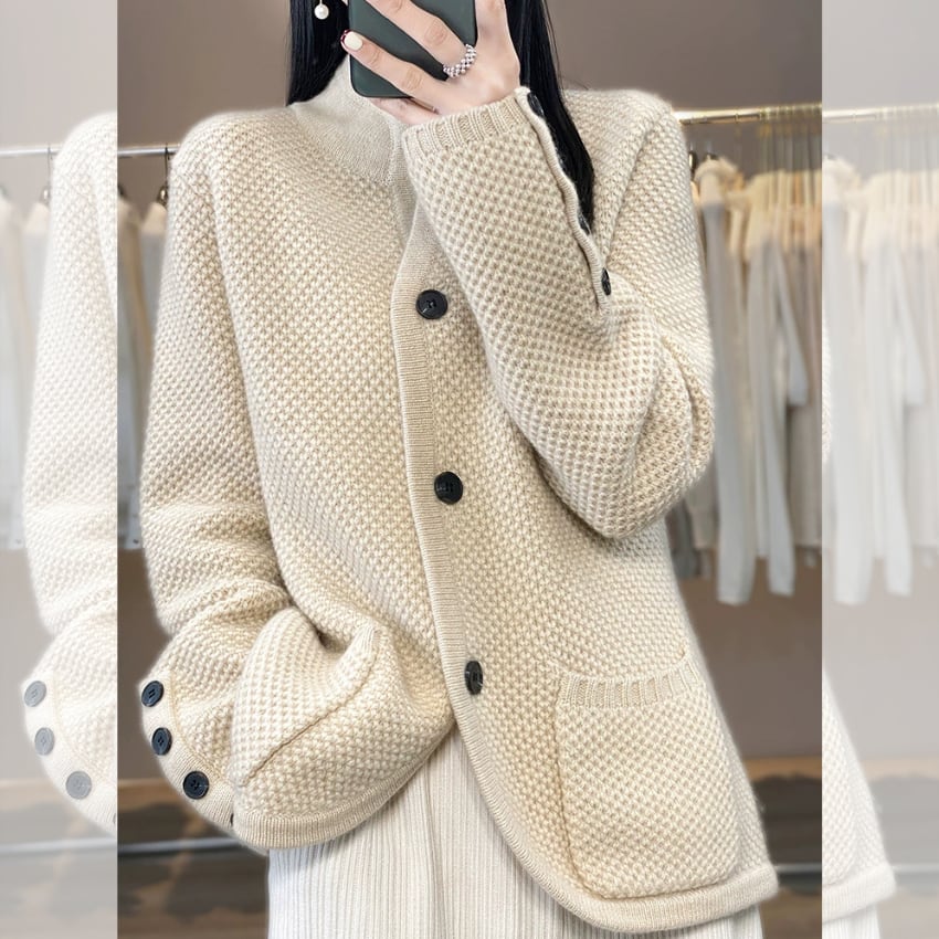 シックで上品なデザインが魅力のデザインニッチスタンドカラーカノコカーディガン。繊細なカノコ編みと立体的なスタンドカラーが、あなたの首元を美しく演出します。コーディネートのポイントとしてもぴったりな一枚です。