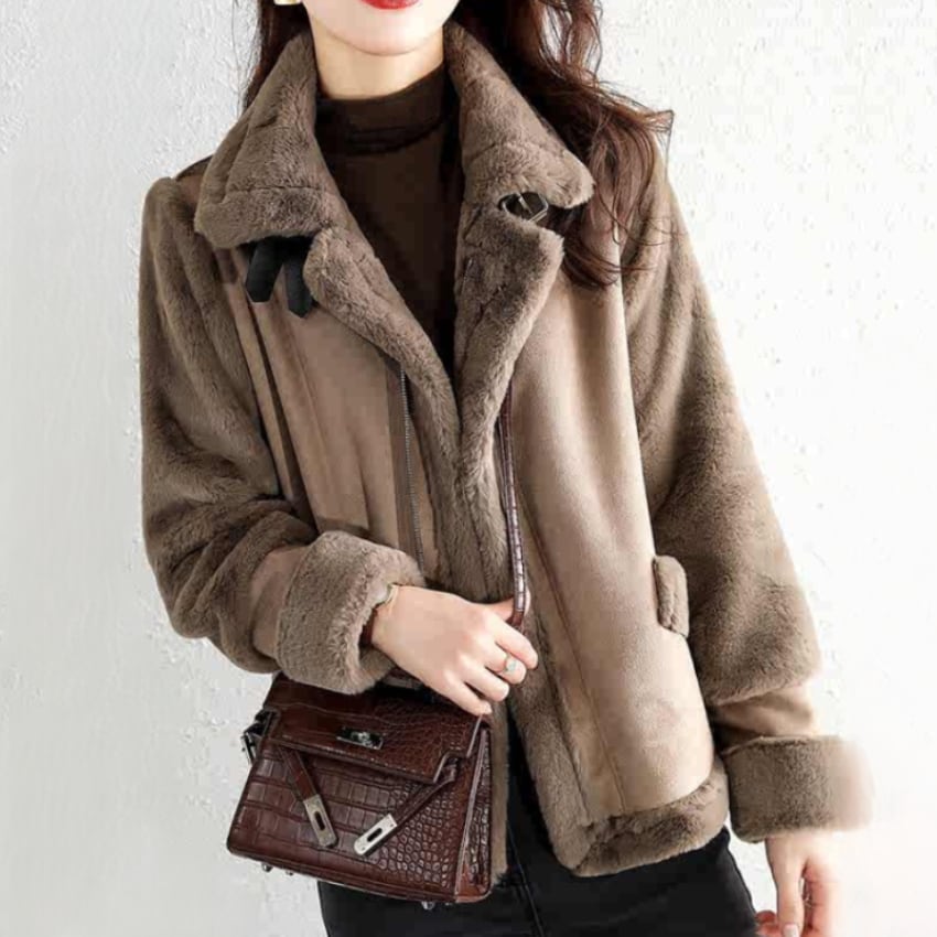 新作スエード調ショートジャケットは、柔らかな印象を与えるライトブラウンの色合いが魅力的なアイテムです。スエード素材ならではの肌触りの良さが特徴で、日常使いや特別な日のお出かけに最適な一着です。シンプルでスタイリッシュなデザインが、どんなコーディネートにも自然に溶け込み、あなたのスタイルを引き立てます。