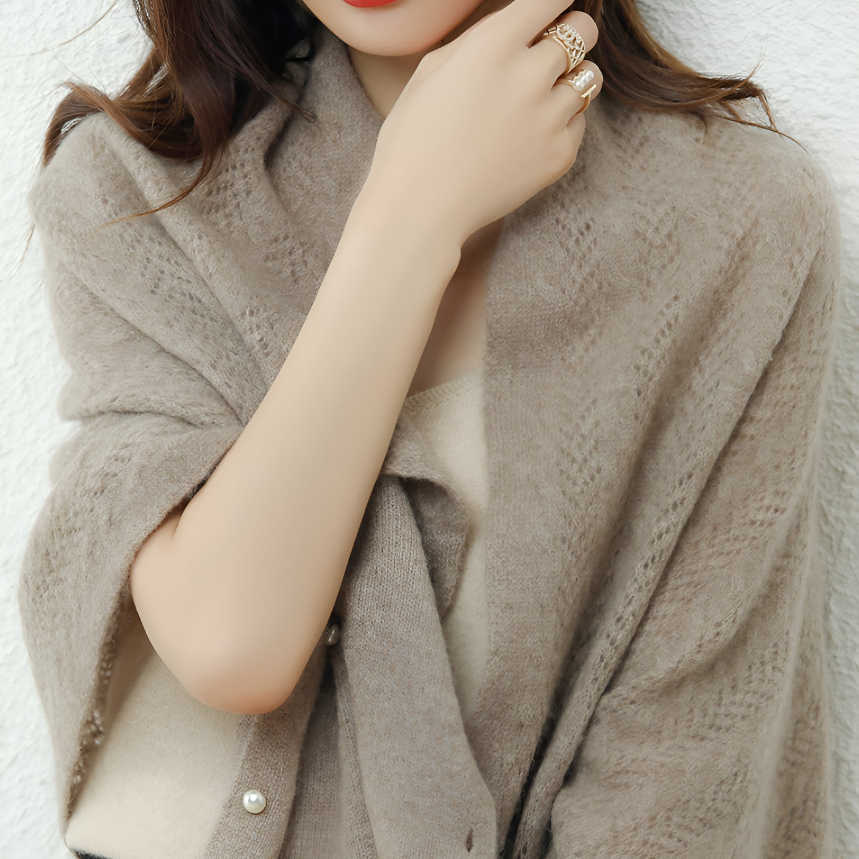 ケープデザインカーディガンは、魅力的なキャメルとベージュの色合いが特徴の一着で、さまざまなコーディネートに自然と溶け込むアイテムです。こちらのカーディガンは特有のケープデザインを備えており、シンプルなスタイリングに優雅さとこなれた印象を与えます。さらりと羽織るだけで、普段のスタイルを一層引き立ててくれます。