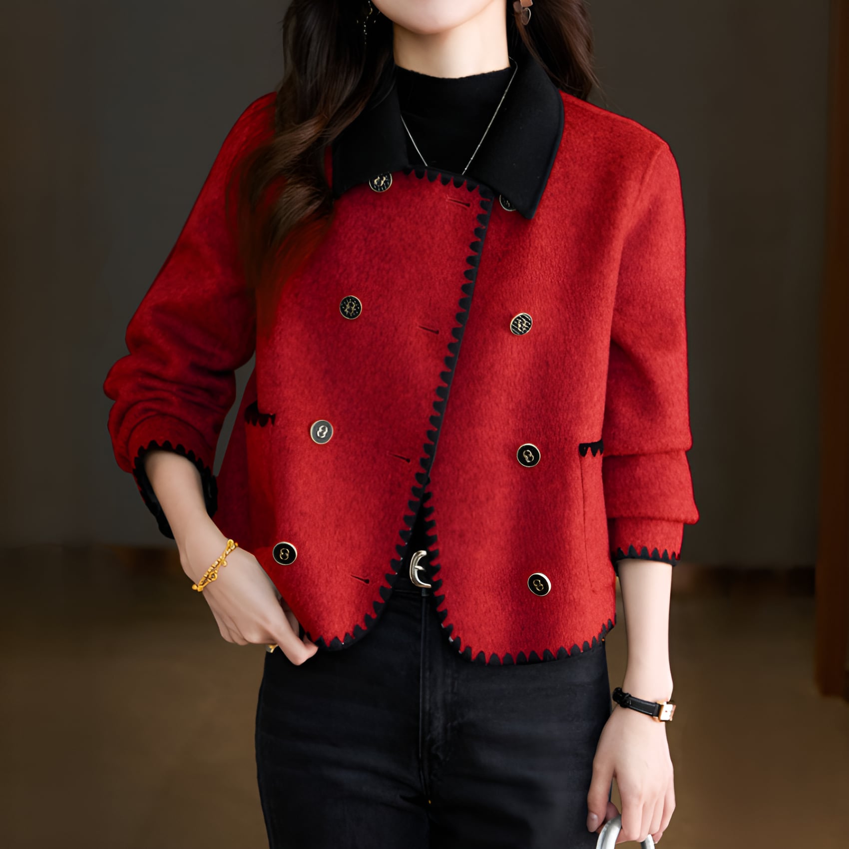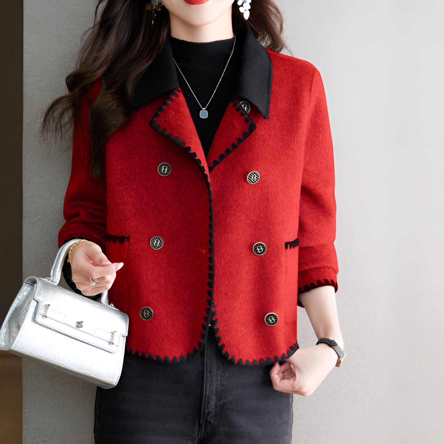 ハイエンドスティッチダブルショートコートは、スタイルと機能性を兼ね備えた魅力的なアイテムです。美しい鮮やかなレッド、落ち着いたグレー、シックなカーキの3色からお選びいただけ、どのシーンでもスタイリッシュに着こなせます。ダブルボタンのデザインが上品さを引き立て、特別な日からカジュアルなシーンまで幅広く活躍します。暖かい素材感が心地よい着心地を提供し、洗練されたシルエットが美しいラインを演出します。